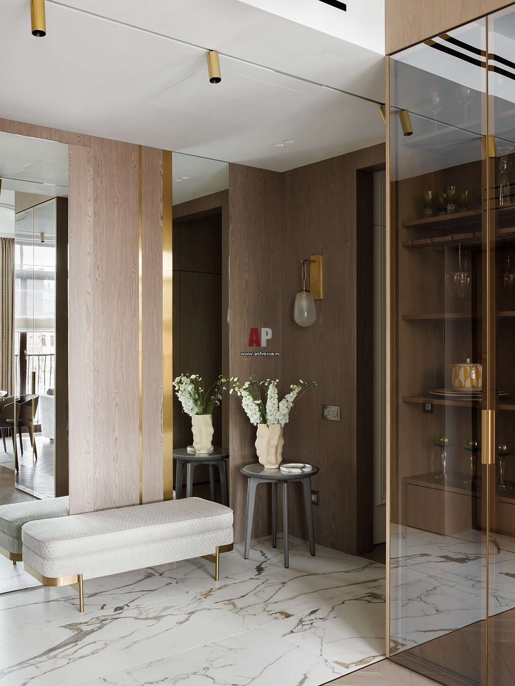 Мягкая неоклассика на Неве. Интерьер прихожей. Стены отделаны деревянными панелями со вставками из латуни со сдержанным блеском.