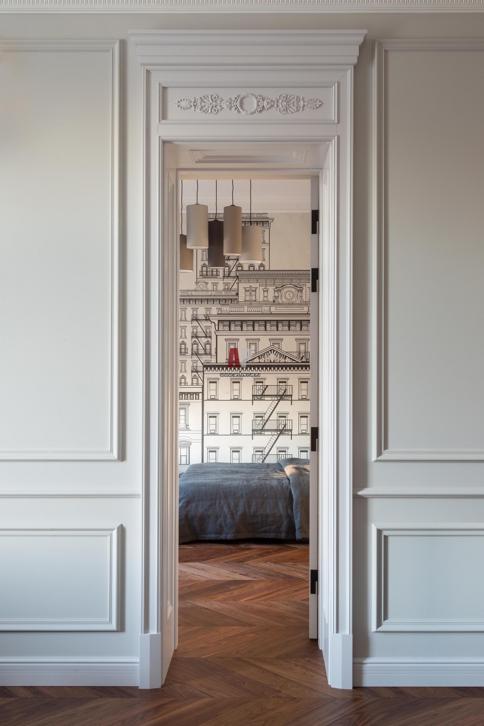 Двухэтажная квартира в доходном доме. Одна из детских на втором этаже. Классические двери с резными порталами изготовлены на заказ по эскизам дизайнеров компанией «Столичная Столярная Компания». Высота дверей вместе с порталом – 3200 мм. Материал: МДФ и массив древесины, украшение портала – резьба по дереву.