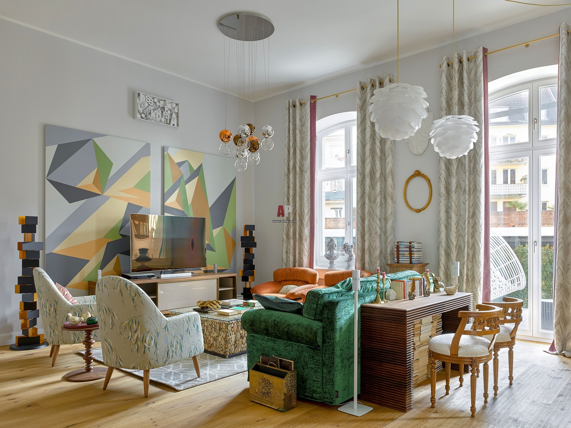 Гостиная разделена на три зоны: диванную группу, рабочее место и обеденную зону. Они выделены с помощью светильников на шнурах-лианах: выводы для люстр были только слева и справа, в центральную зону их пришлось тянуть.