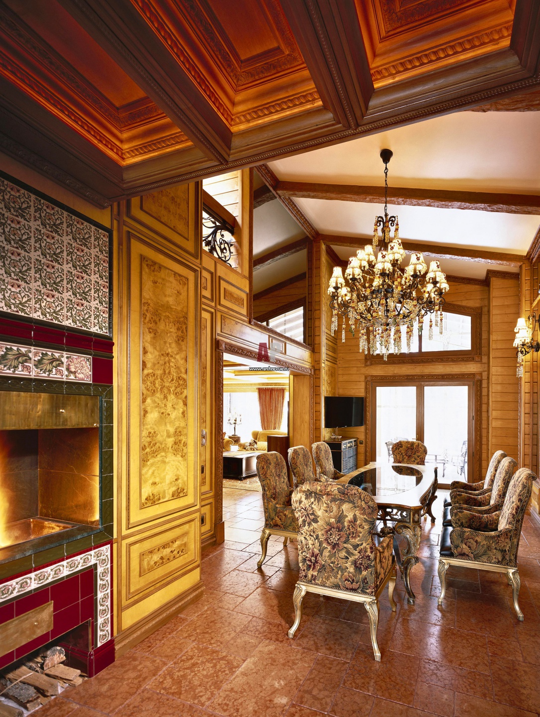 Парадная столовая группа. Пол первого этажа выложен состаренным мрамором винного цвета. Открытый очаг украшен изразцами ручной работы. Стены облицованы панелями из горного тополя.