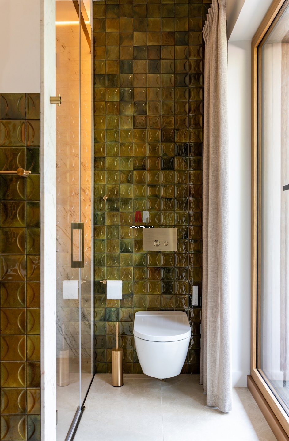 Дом в сосновом лесу. В интерьере санузла использованы природные мотивы.
