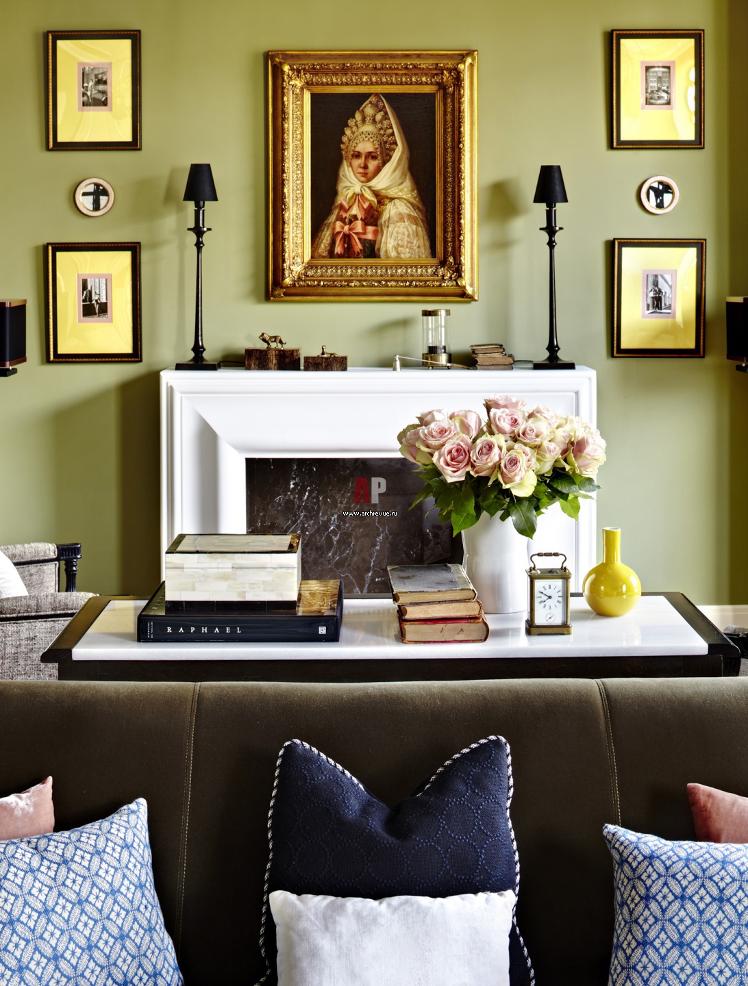 Зона камина в гостиной. Биокамин обрамлен порталом из гипса Atelier Sedap, поставщик Skol. Картины написаны мамой хозяина квартиры.