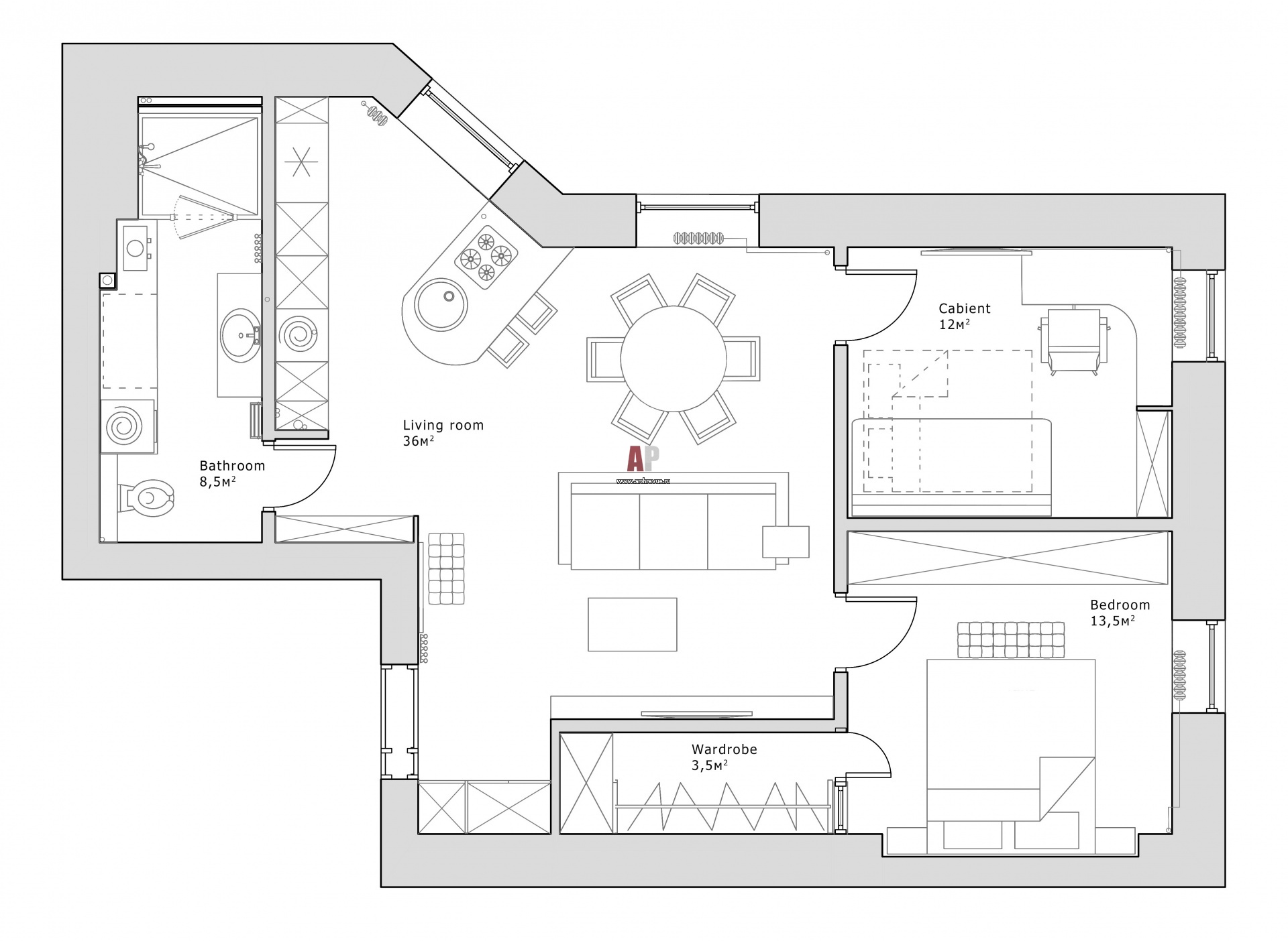 План трехкомнатной квартиры в доме 1925 года постройки в районе Цветного бульвара. Общая площадь – 73 кв. м.