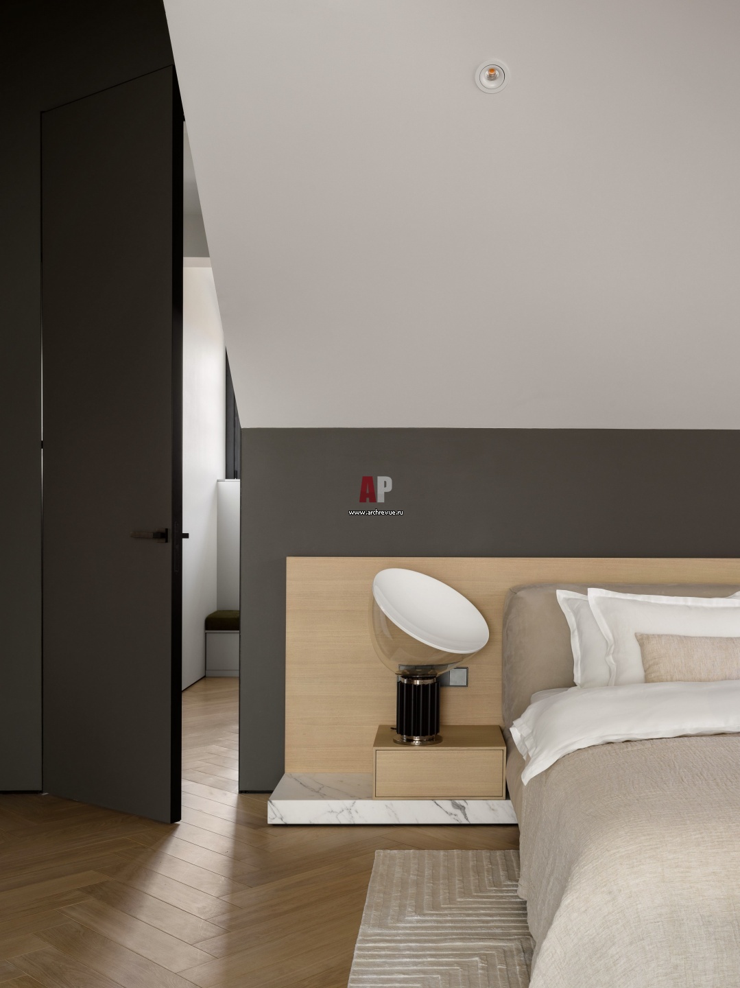 Дом у озера с природной палитрой и текстурами. Хозяйская спальня.