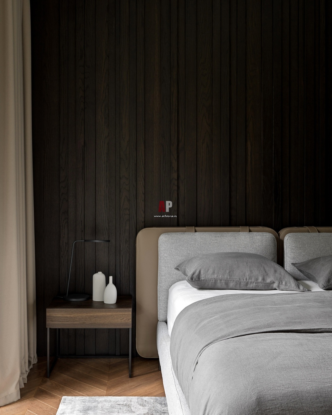 Изголовье кровати собрано вручную из реек темного дерева разной ширины. Кровать, Minotti.