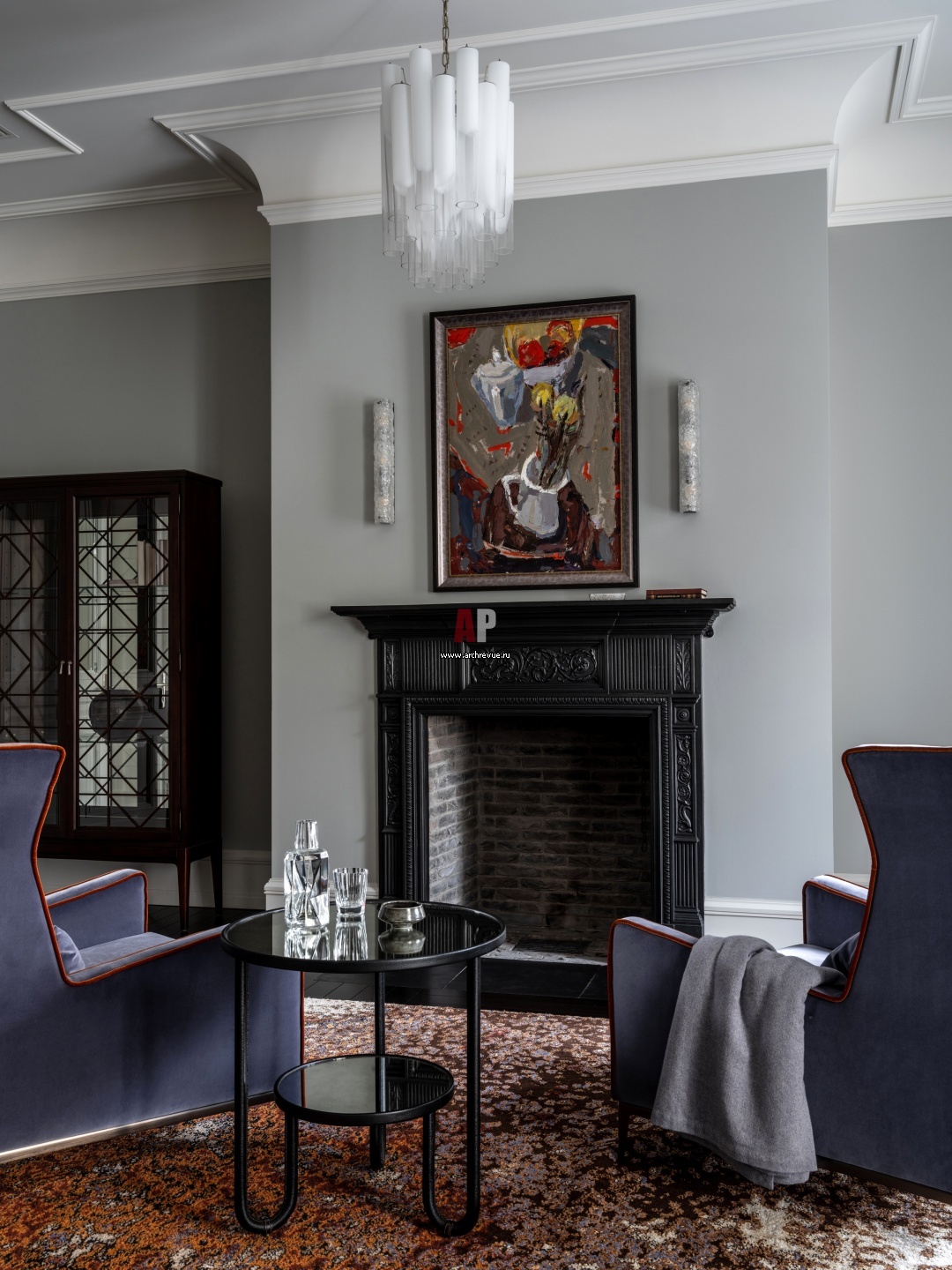 Декоративный акцент главной спальни – камин. Его обрамляет привезенный из Франции чугунный портал начала прошлого века. Кресла, Arketipo. Люстра, Mazzega 1946, dis Сarlo Nason, Италия, 1970-e годы. Картина Кирилла Василенка.