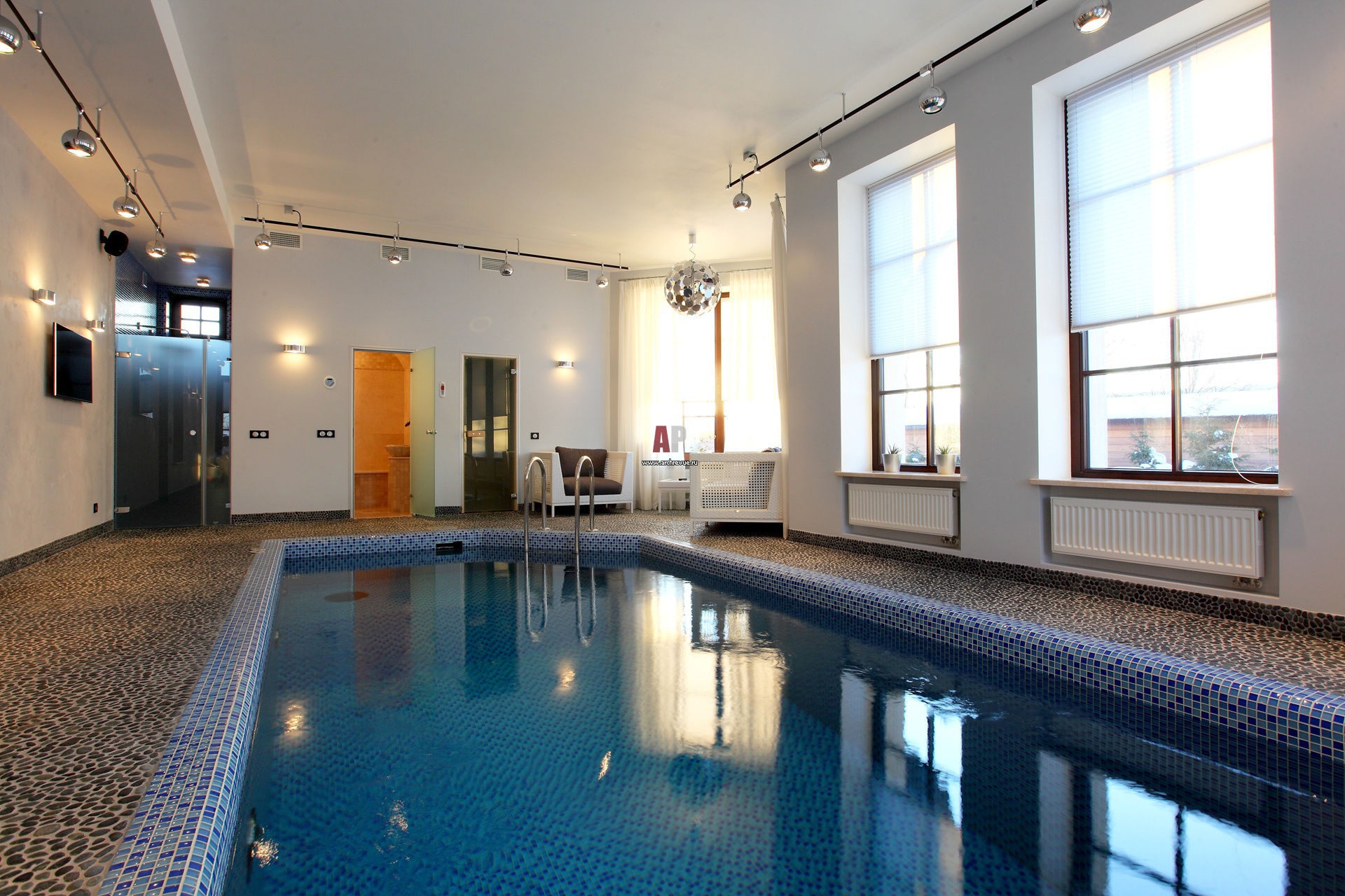 Бассейн с банным комплексом расположен на первом этаже. Чаша бассейна выложена мозаикой сине-голубого цвета, создающей настроение Средиземноморского пляжа.