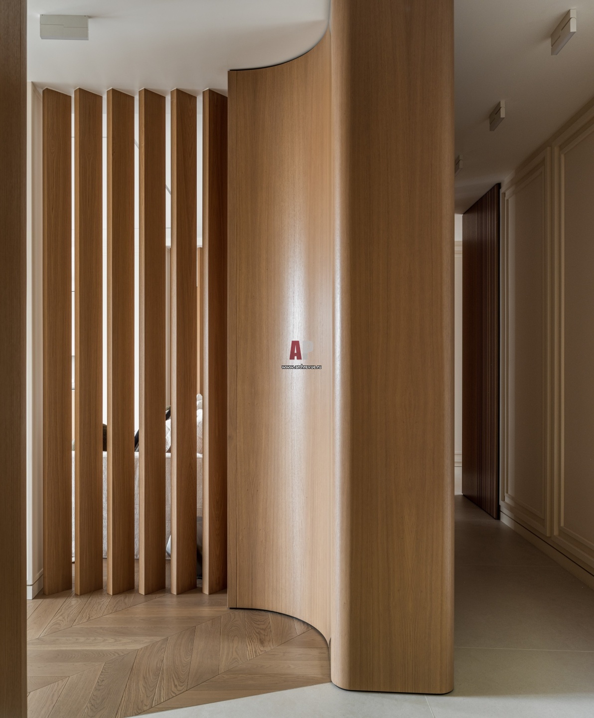 Семейная квартира с деревянными перегородками и радиусными панелями. Прихожая. Керамогранит, Atlas Concorde.