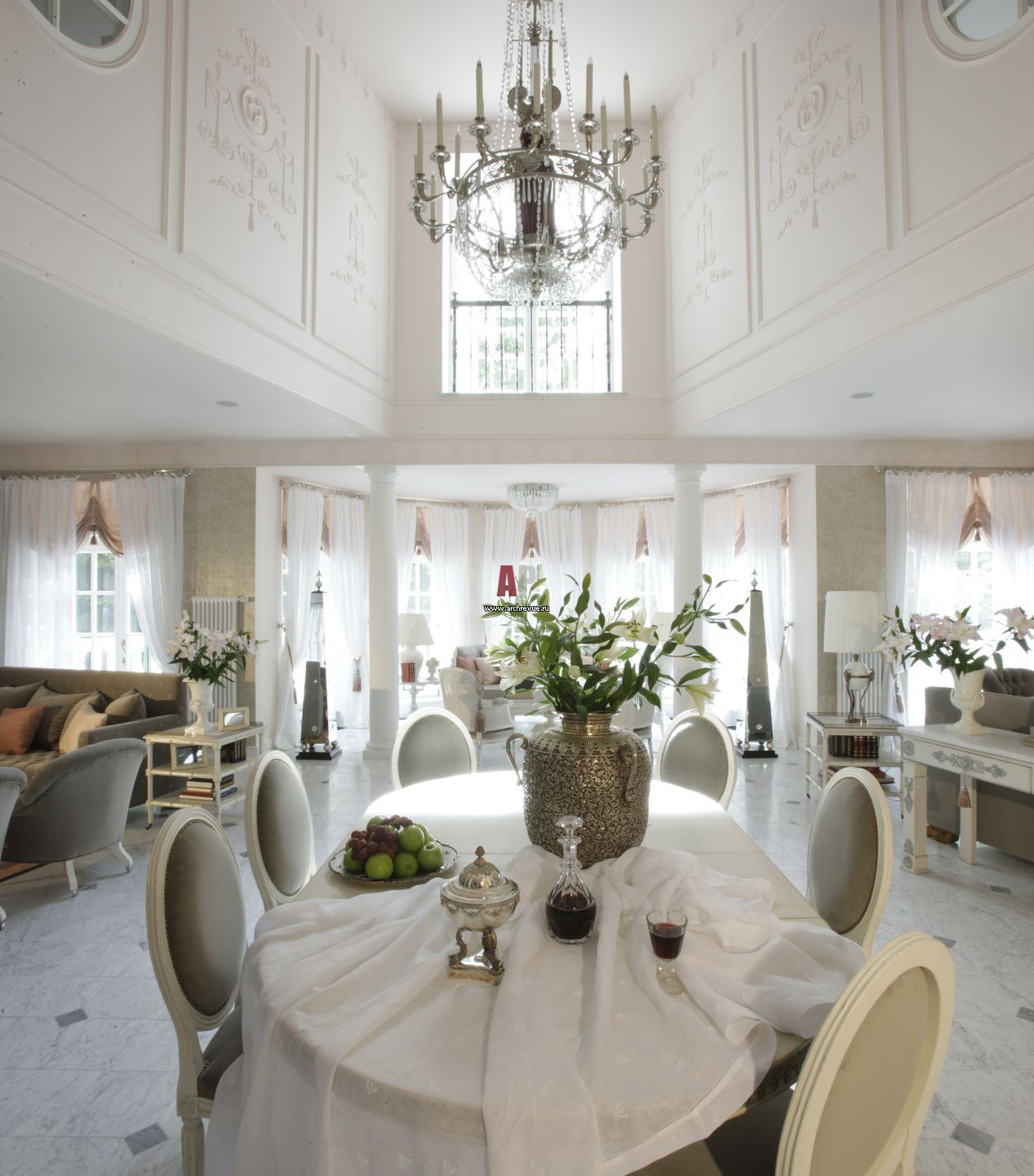 В центре презентационной зоны – обеденный стол Moissonnier. Он акцентирован парадной люстрой Mathieu Lustrerie из стекла и состаренного серебра – современной репликой светильника времен Наполеона I. Стены второго уровня украшены тончайшим кружевом французской лепнины Auberlet et Laurent.