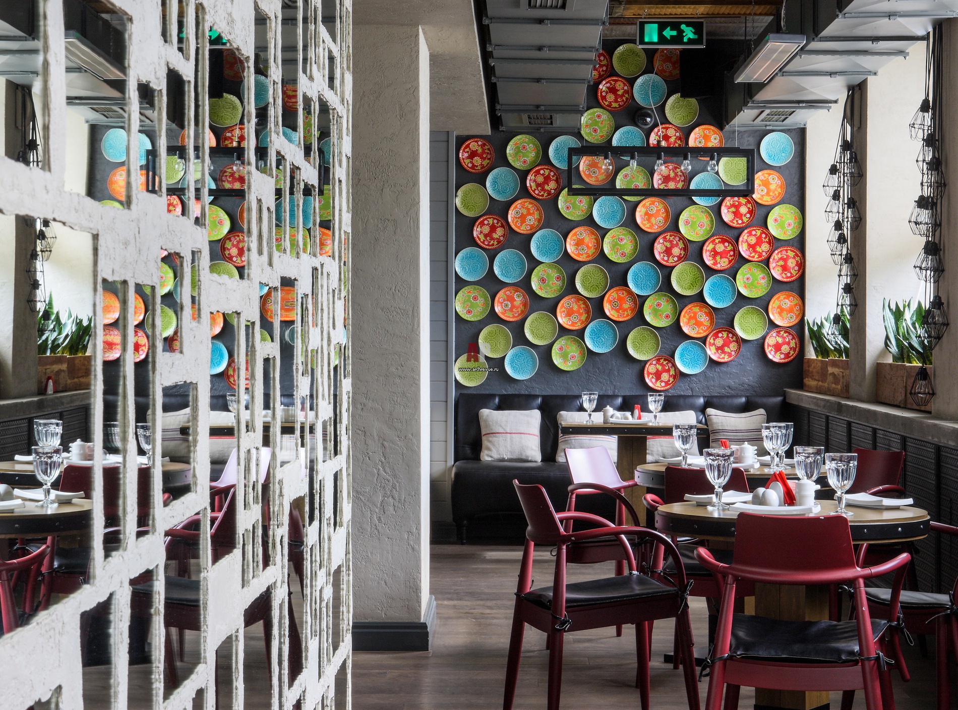 Самая дальняя от входа, торцевая стена оформлена как роскошное восточное панно. Она выкрашена декоративными штукатурками сложного серого цвета и на всю высоту украшена пестрыми керамическими тарелками оранжевого, голубого и салатового цветов.