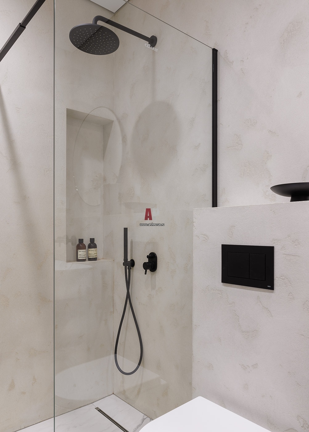 Небольшая трехкомнатная квартира. Зона душевой в гостевом санузле.