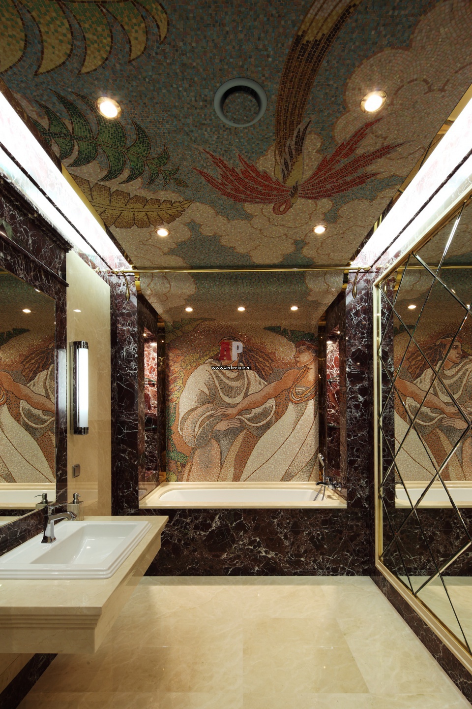 В санузле есть ванна. В основе мозаичного панно – сюжет из древнегреческой мифологии. Мозаичные работы, «Архипов Савва ИП». Сантехника, Villeroy & Boch.