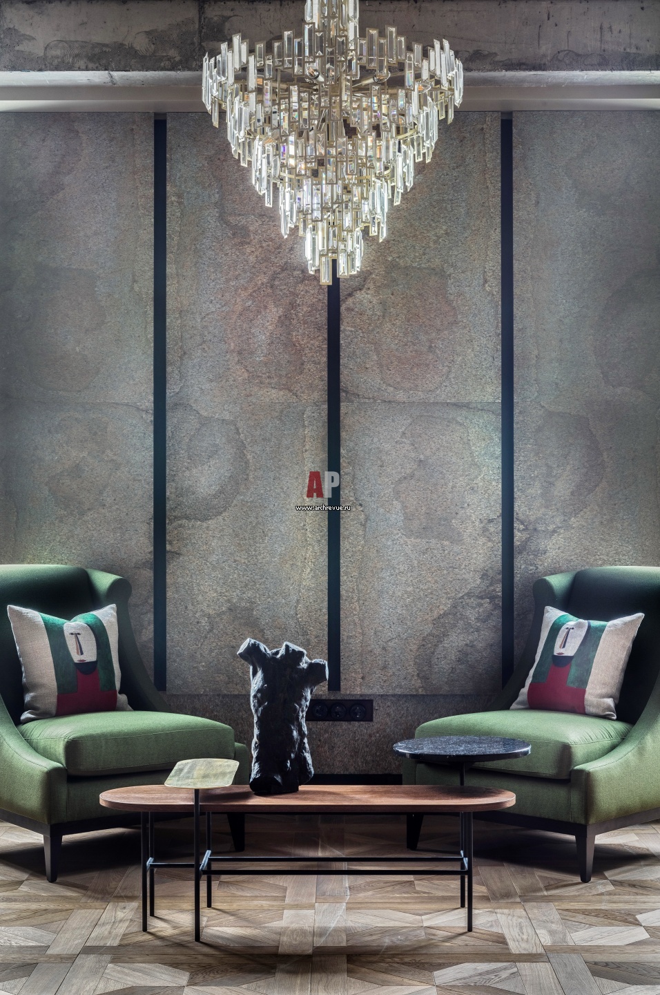 Зона отдыха у окна. Стеновые панели, шпон гранита. Каскадная люстра MW-Light рифмуется с силуэтом высотки МГУ. Кресла, Dantone Home.