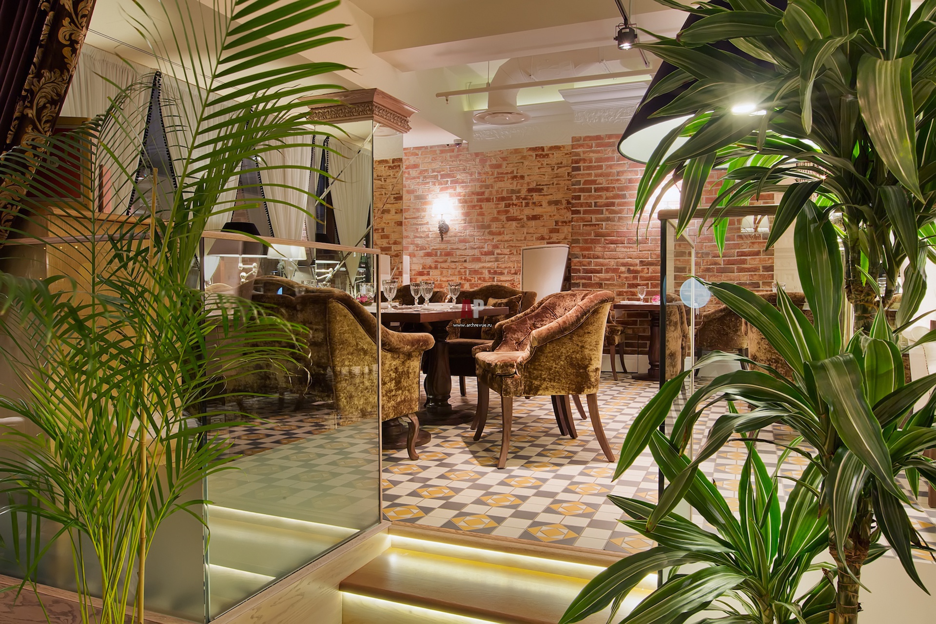 Интерьер ресторана украшен живыми растениями в кадках. Обилие зелени создает ощущение загородного пространства.
