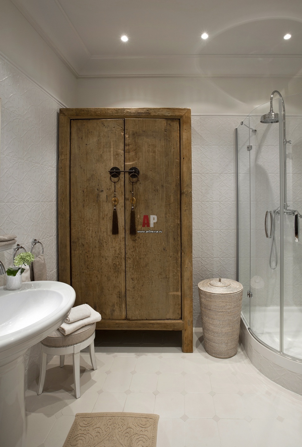 Ванная комната дочери. На стенах - тунисская плитка Doremail (коллекция Cordoba), на полу – метлахская плитка Winckelmans, поставщик «Грета Вульф». Шкаф из состаренного дерева, Casa Pagoda. Умывальник, Villeroy & Boch. Душевые перегородки, Hueppe.