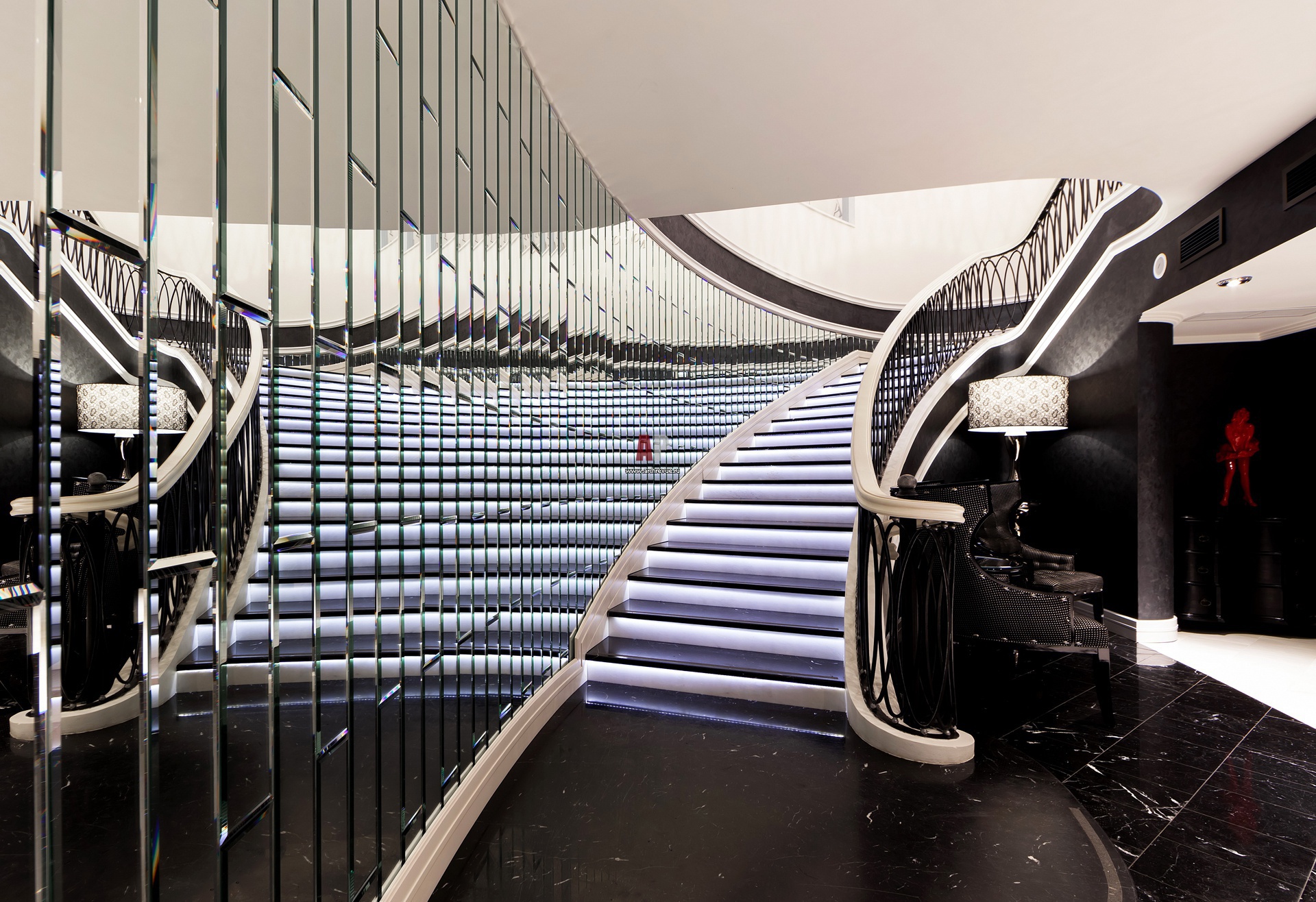 Дизайн лестничного холла роскошного ресторана с изогнутой лестницей. Интерьер в стиле ар-деко поддержан ковкой, черным полированым камнем и зеркальными панелями на стене.