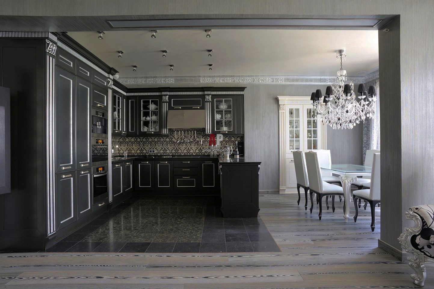 Кухня объединена с гостиной широким открытым порталом. Напольная плитка, кухонный фартук изготовлены из мрамора Petra Antiqua, украшенный серебристым вытравленным рисунком.