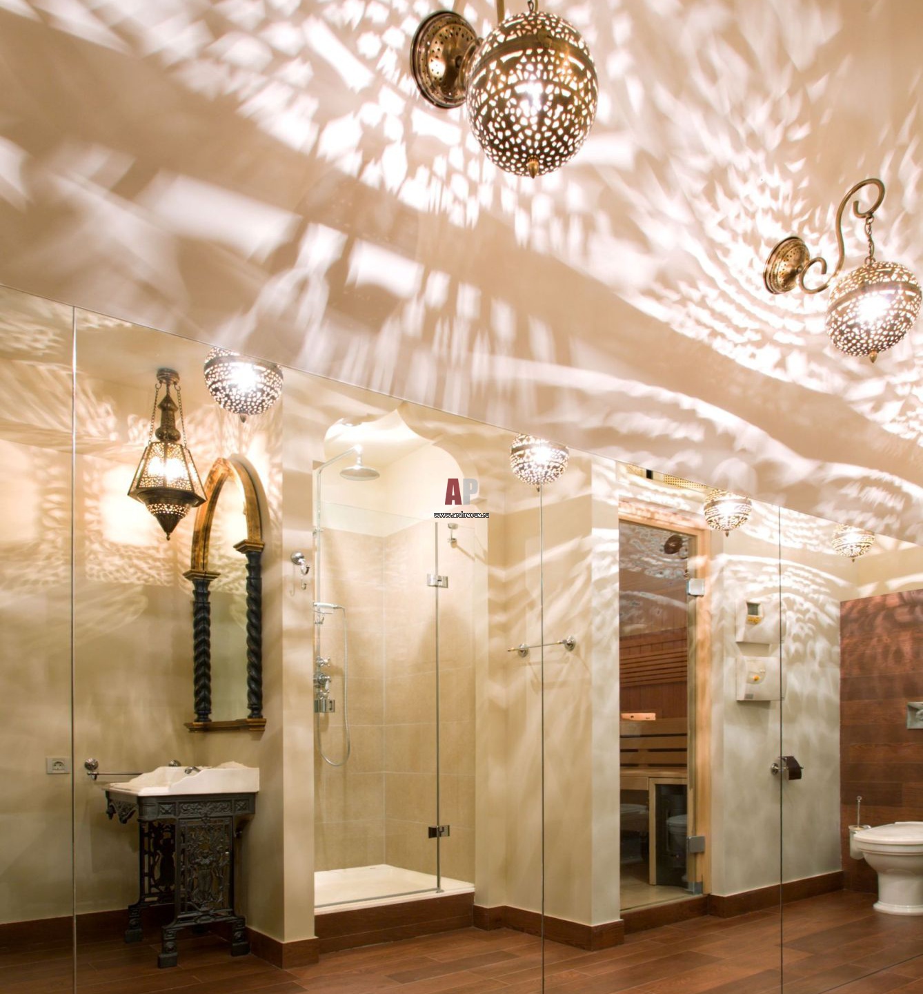 Сауна примыкает с приватной гостиной на втором этаже. Бесшовная зеркальная стена увеличивает пространство. Светильники с ажурными прорезями выполнены вручную.