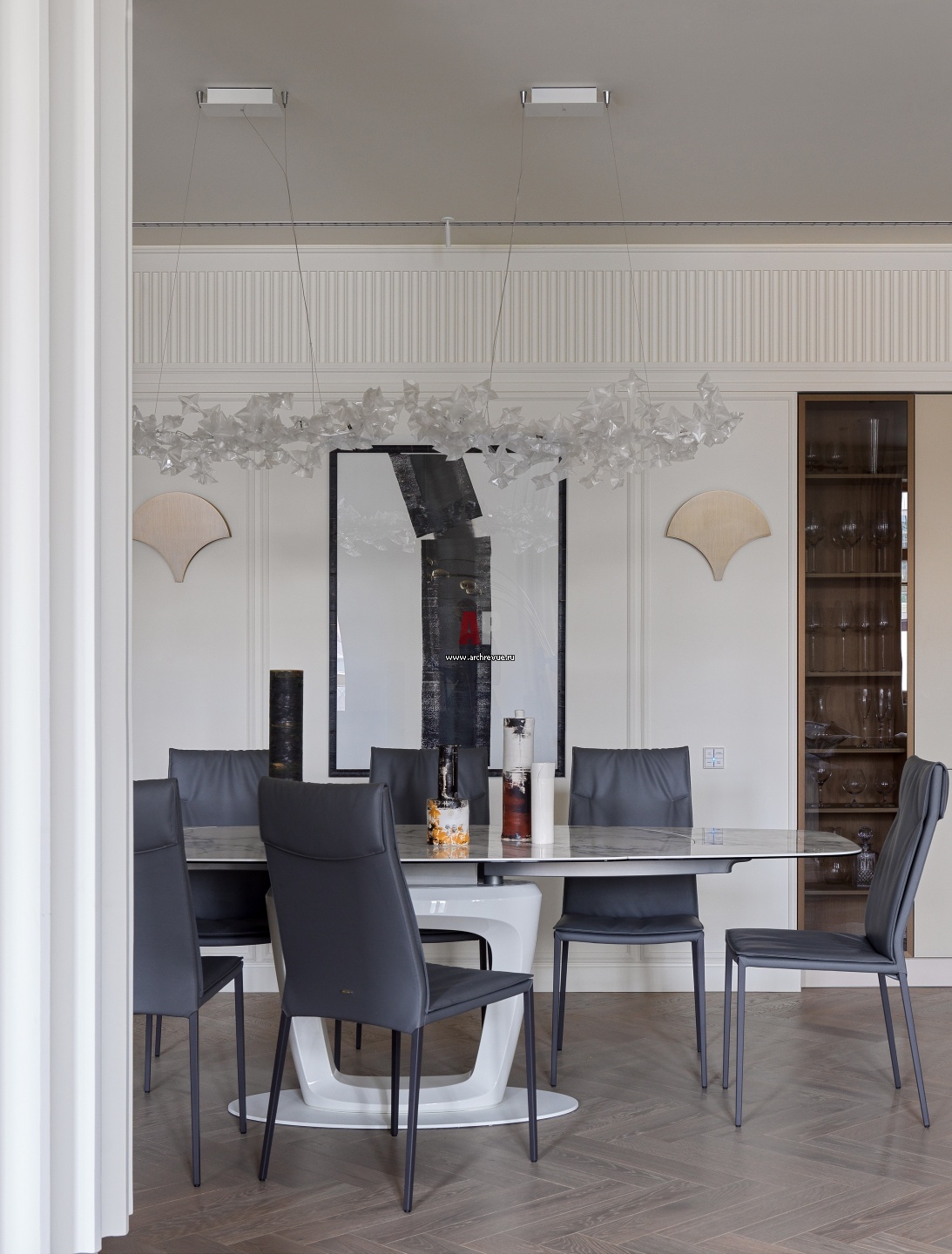 Стена за обеденной группой зашита деревянными панелями. Встроенные витрины, Leicht. Широкий лепной фриз под потолком выполнен из гипса.