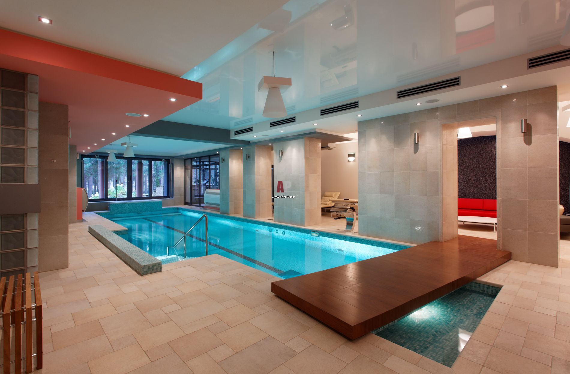 Цокольный этаж – многофункциональное пространство для отдыха и релаксации. Здесь размещены: бассейн, русская баня, турецкий хамам, тренажерный зал, солярий, бар. Их монтаж осуществляла компания «Строй-Басс»