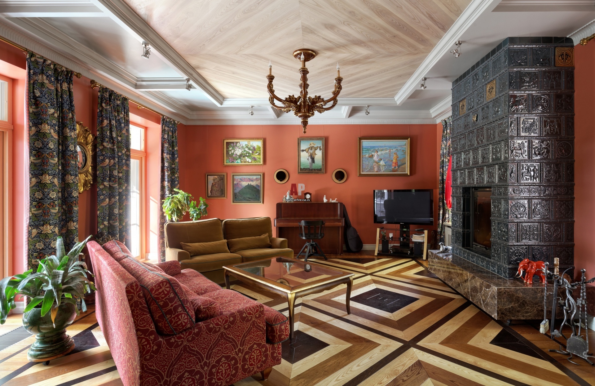 Стены в гостиной выкрашены в насыщенный терракотовый цвет. С ним контрастируют темно-бирюзовые изразцы камина. Они выполнены по мотивам древнерусских владимирских изразцов и украшены былинными животными. На стенах – живописные работы Юлия Ведерникова.