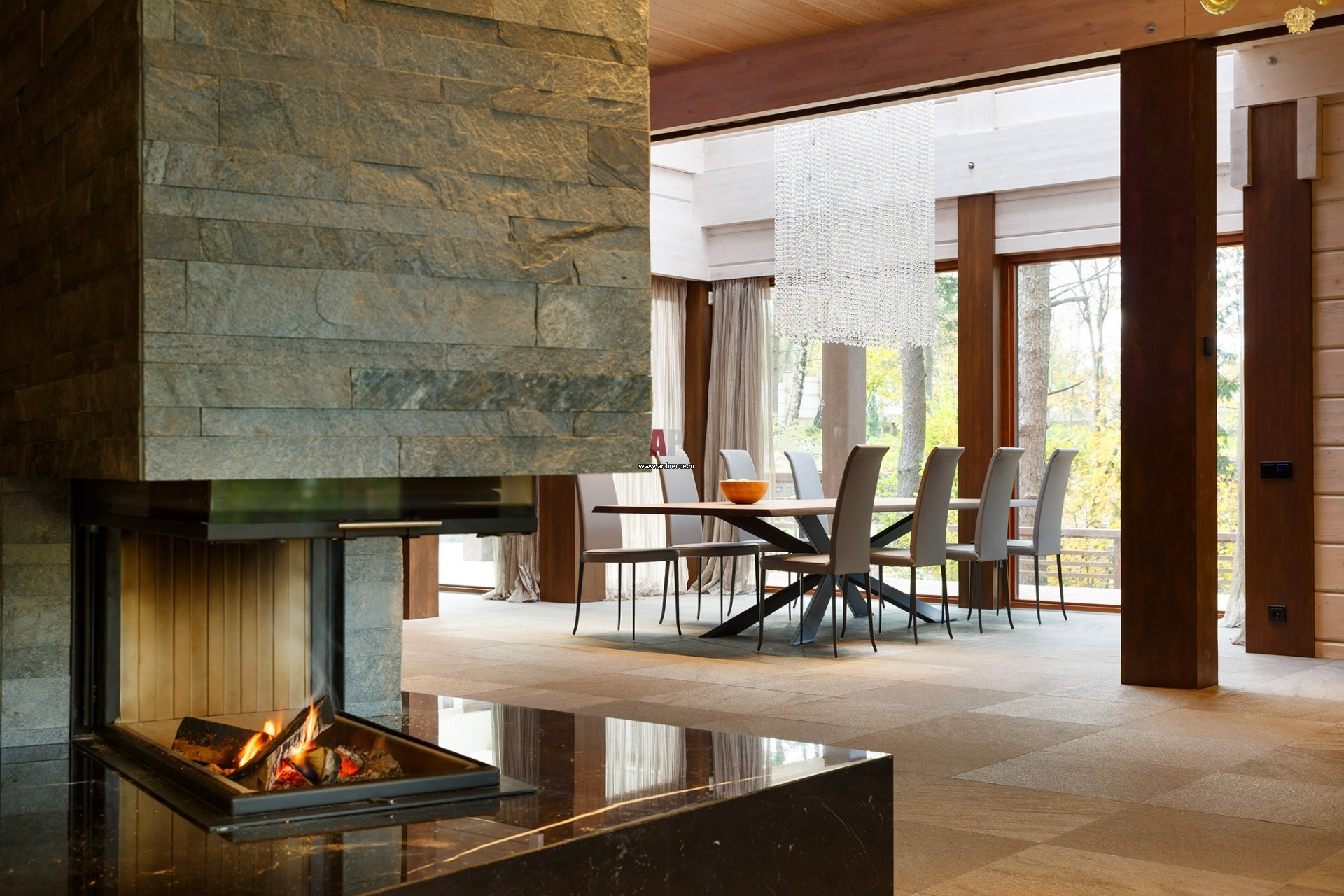 Вид от камина на столовую группу. Камин облицован серым пиленым сланцем.