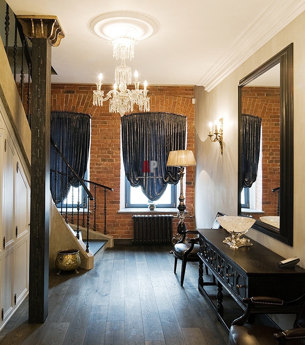 Квартира расположена в доме 1907 года постройки. Стены из красного кирпича и потолочные балки, аутентичные. Консоль из черного дерева, антиквариат.