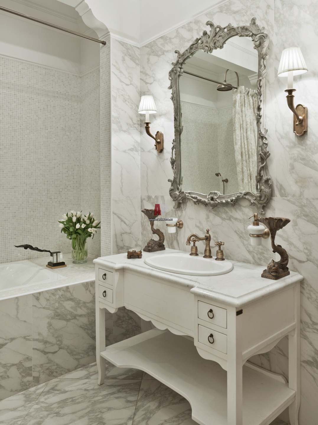 Хозяйская ванная комната облицована керамическим гранитом, имитирующим мрамор от фабрики Rex (коллекции I bianci).