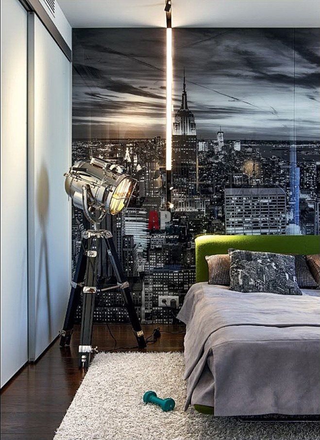 Комната младшего сына находится на первом этаже. Стена за кроватью оформлена баннером с видом Нью–Йорка.