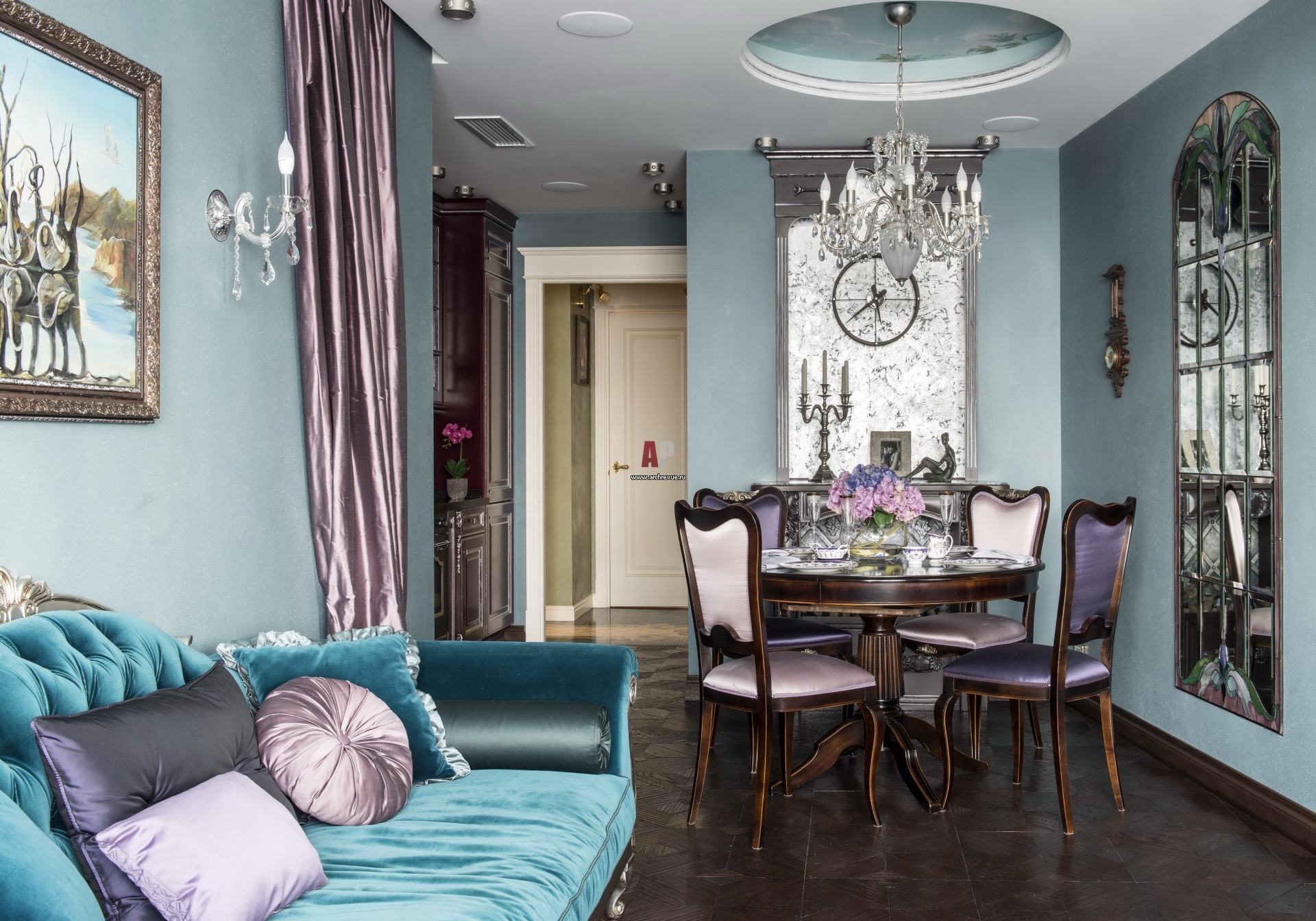 Классическая квартира в насыщенных лиловых, бирюзовых и зеленых цветах