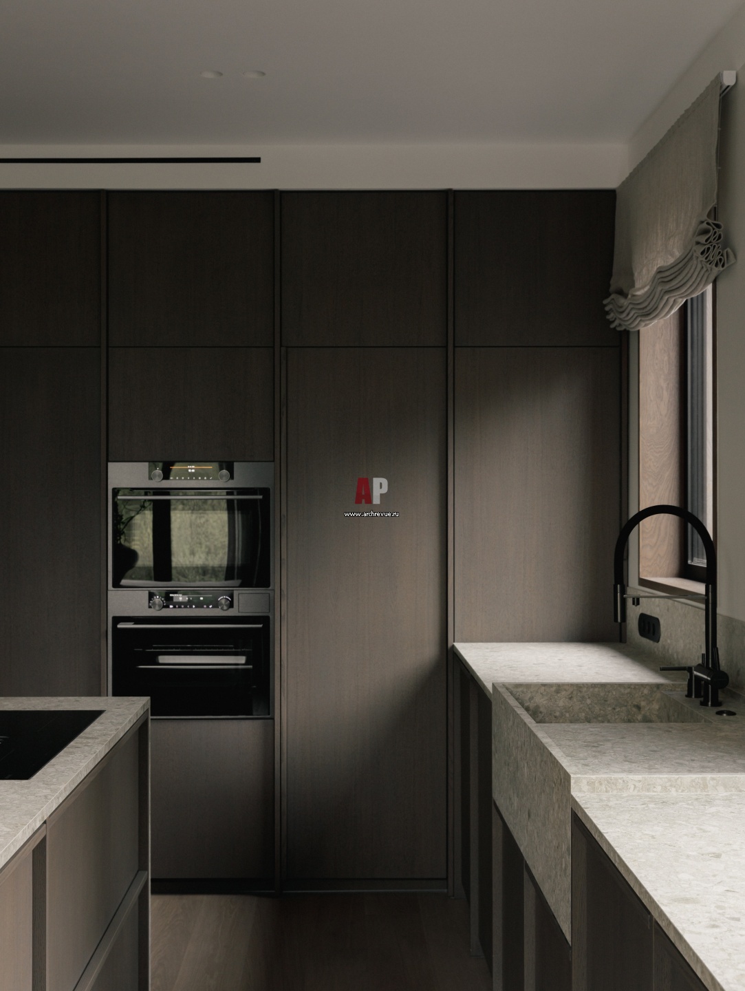 Кухня. Колонны со встроенной техникой. Закрытые фасады изготовлены из темного шпона. Мойка выполнена из камня и интегрирована в столешницу.