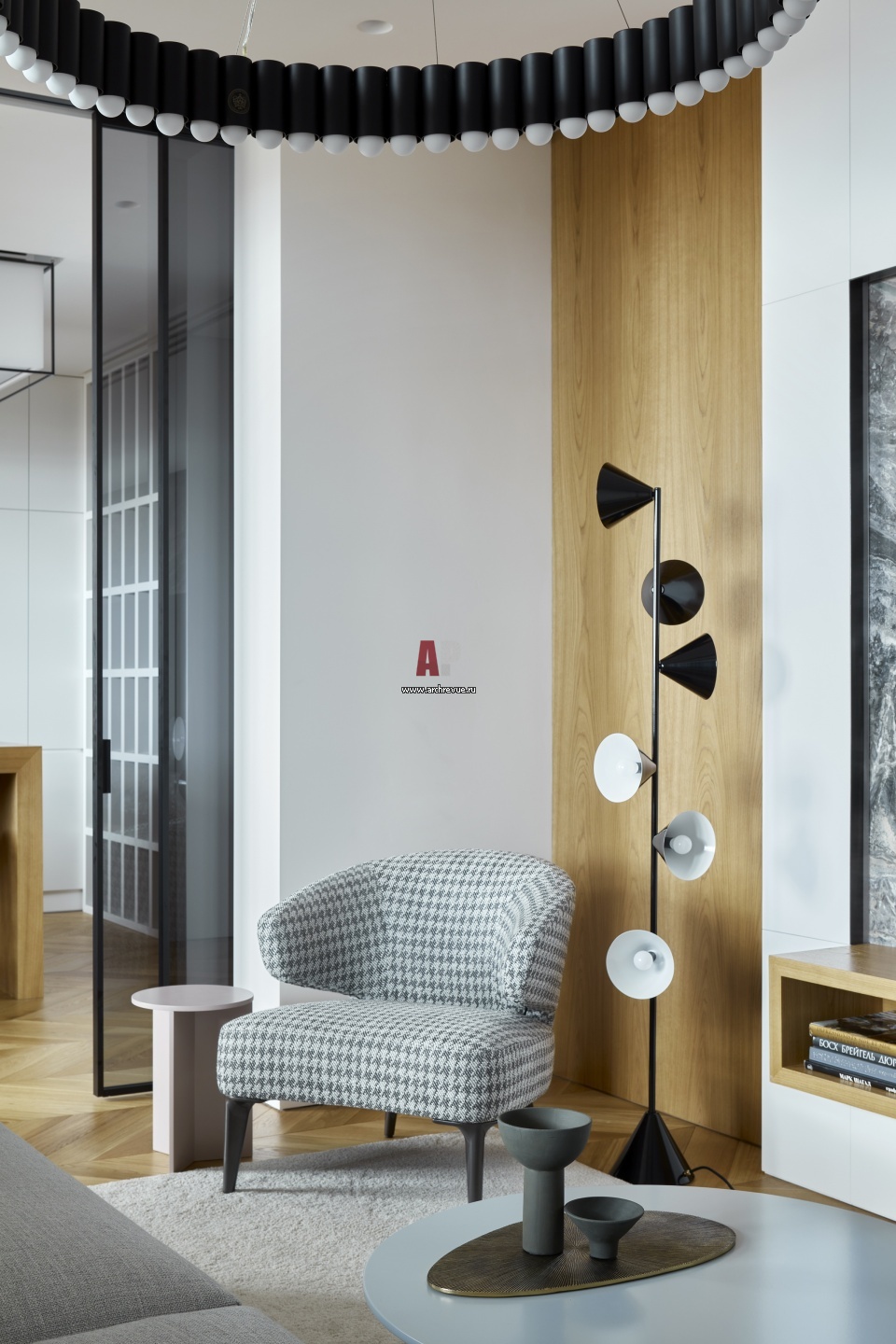 Фрагмент гостиной. Торшер, Atelier Areti, модель Vertical One. Кресло, Minotti, модель Aston.