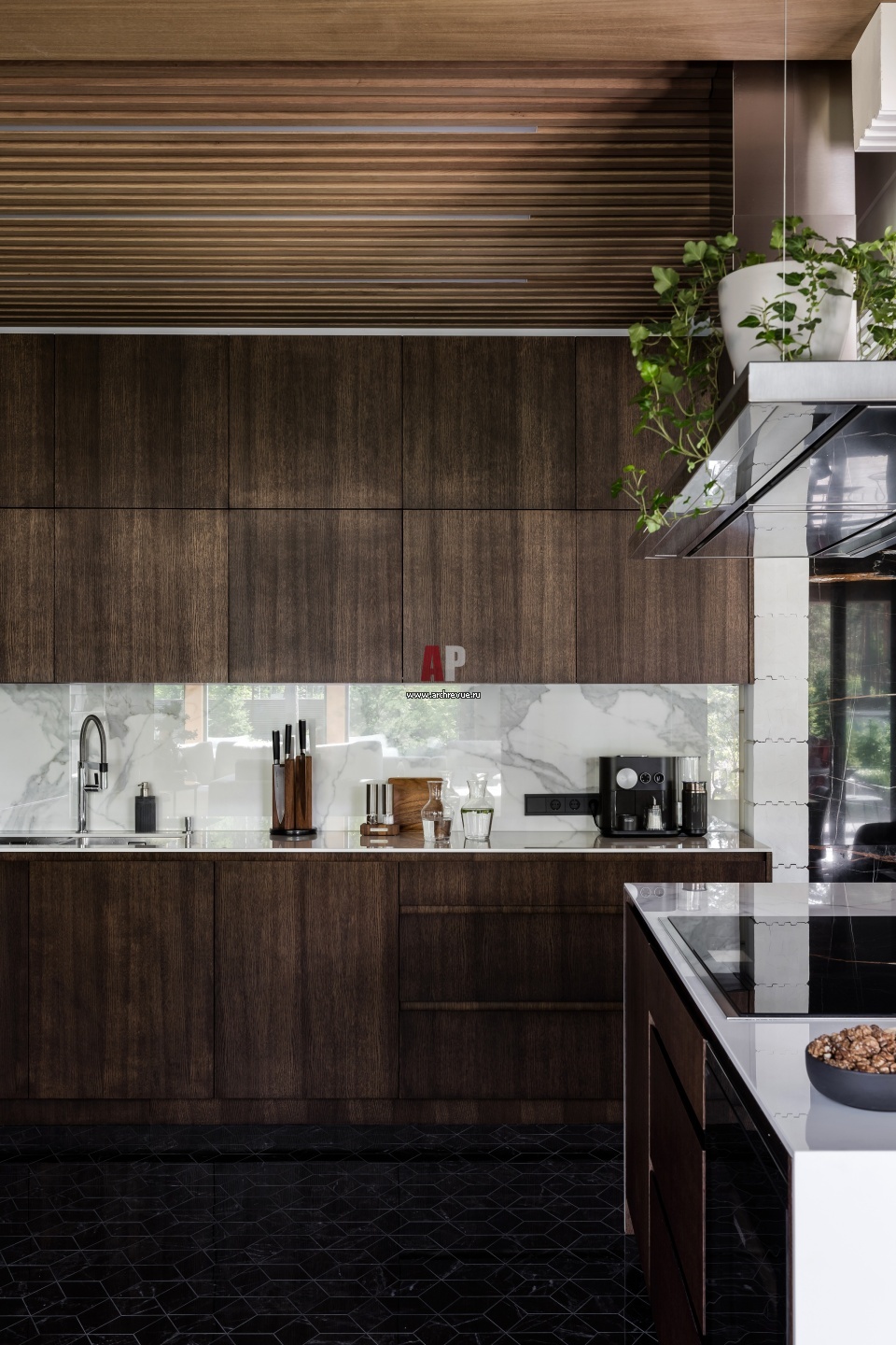 Кухня из шпона дуба сделана на заказ по эскизам автора проекта. Встроенная техника, Neff.