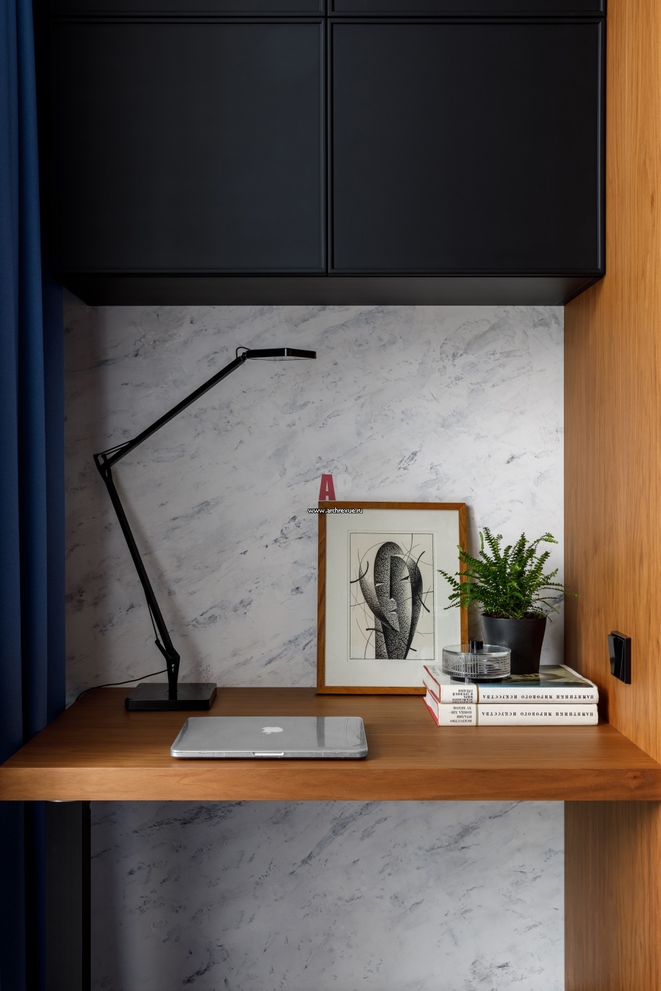 Рабочая зона в кабинете. Деревянный рабочий стол сделан на заказ. На стене – декоративная штукатура, имитирующая мрамор. Светильники, Linea Light.