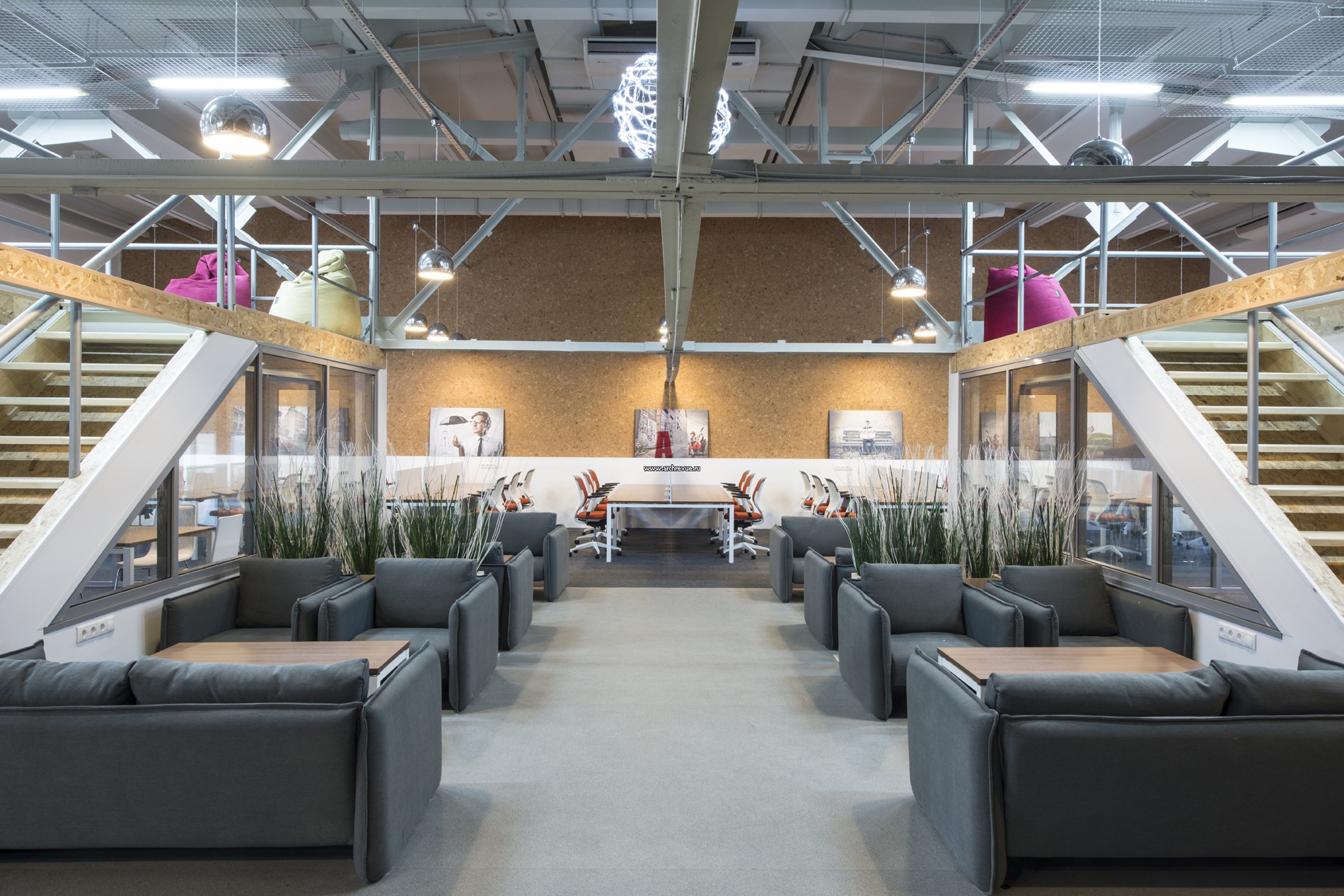 Общая зона для работы за ноутбуком. Полы изначально планировалось сделать наливными, но за три дня до сдачи архитекторы уложили коммерческий линолеум Tarkett (коллекция Acczent Mineral) с высокой устойчивостью к износу.