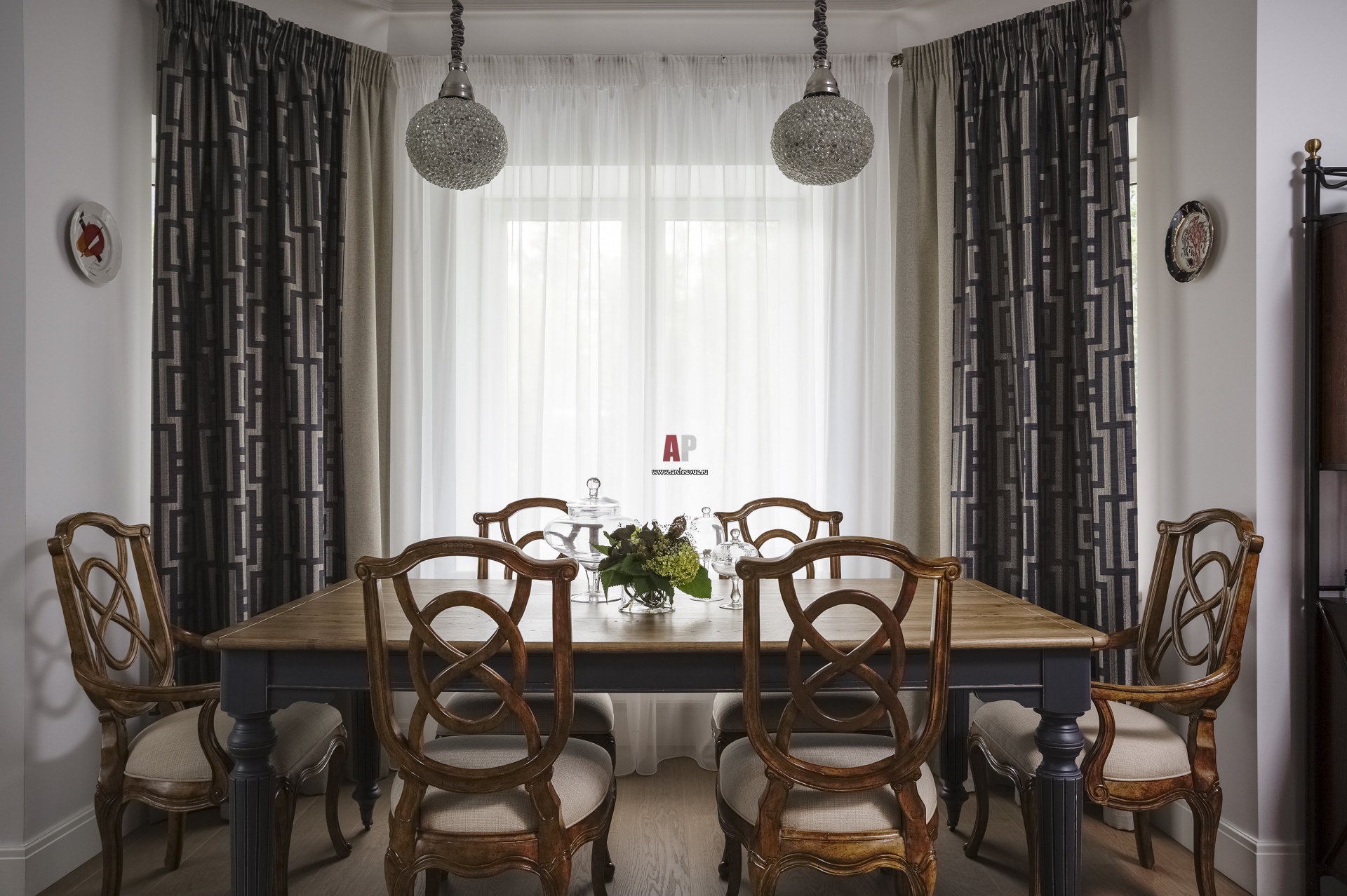 Обеденная группа занимает отдельное помещение. Американский столовый гарнитур из патинированного дерева.