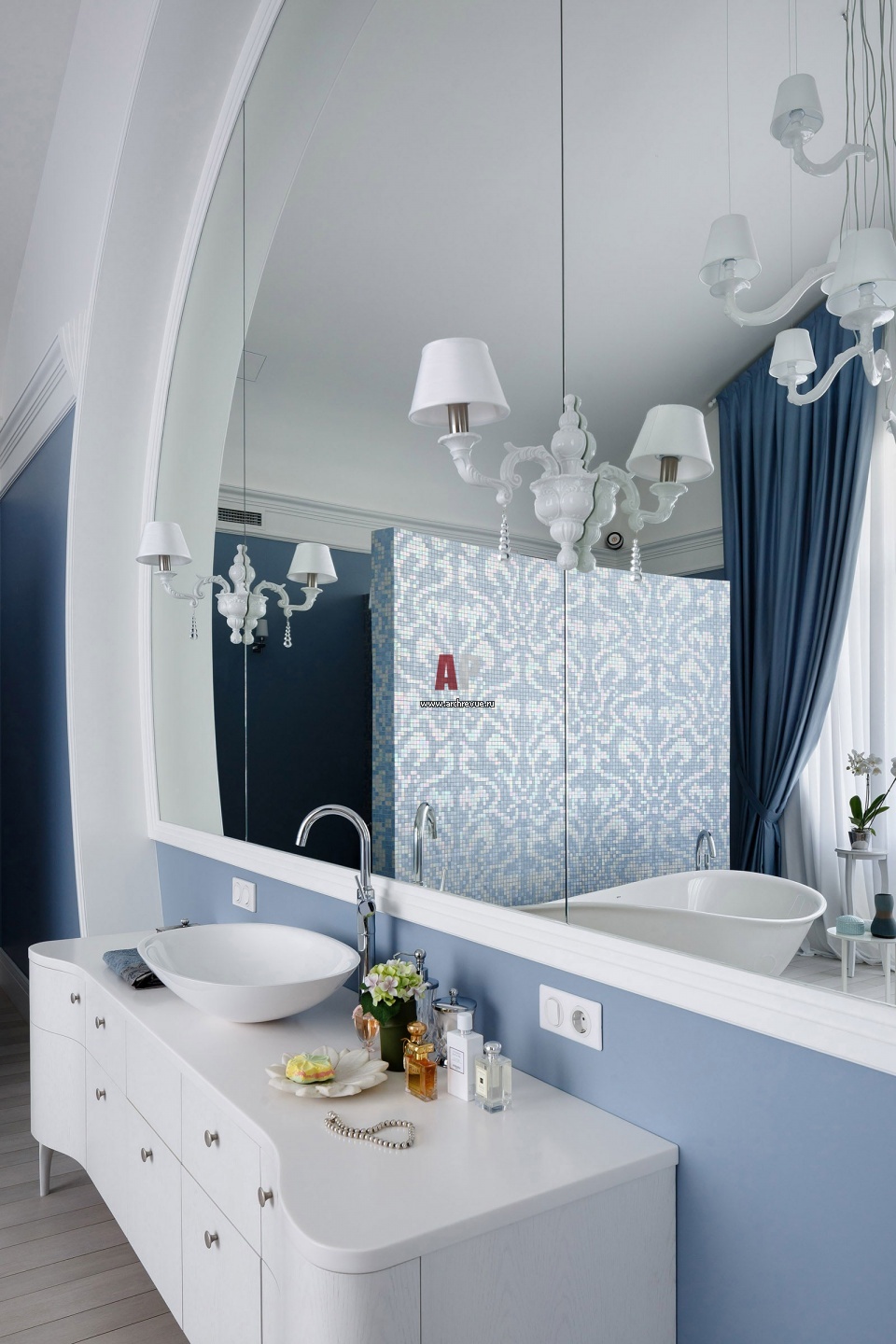 Интерьер санузла ванной комнаты дома в стиле облегченной классики.