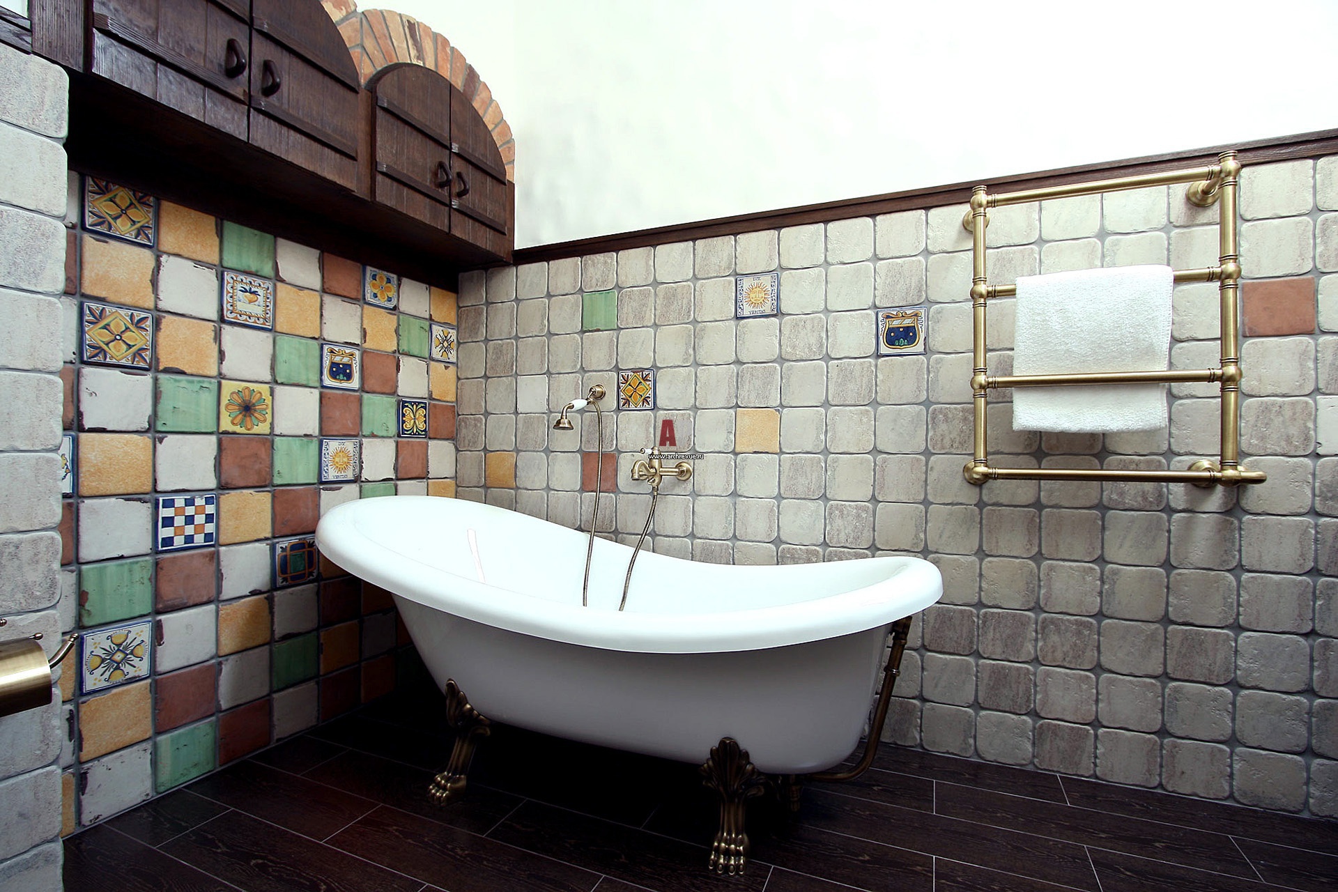 Хозяйская ванная комната в доме в стиле шале. Стены облицованы керамической глазурованной плиткой ручной работы. Ванна на лапах, Devon & Devon.