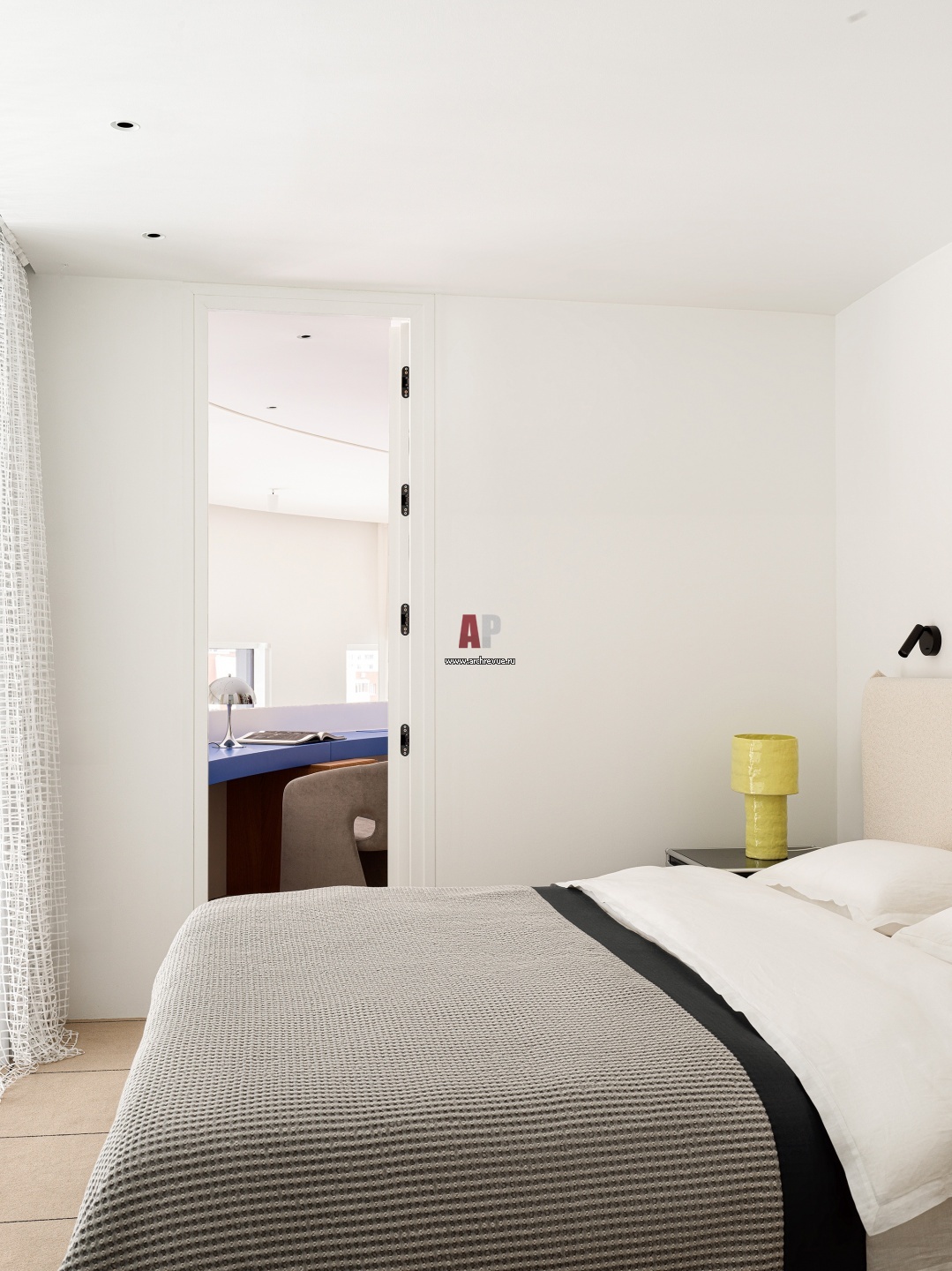Двухэтажная квартира с радиусной планировкой, скульптурной лестницей и элементами стиля баухаус. Родительская спальня.