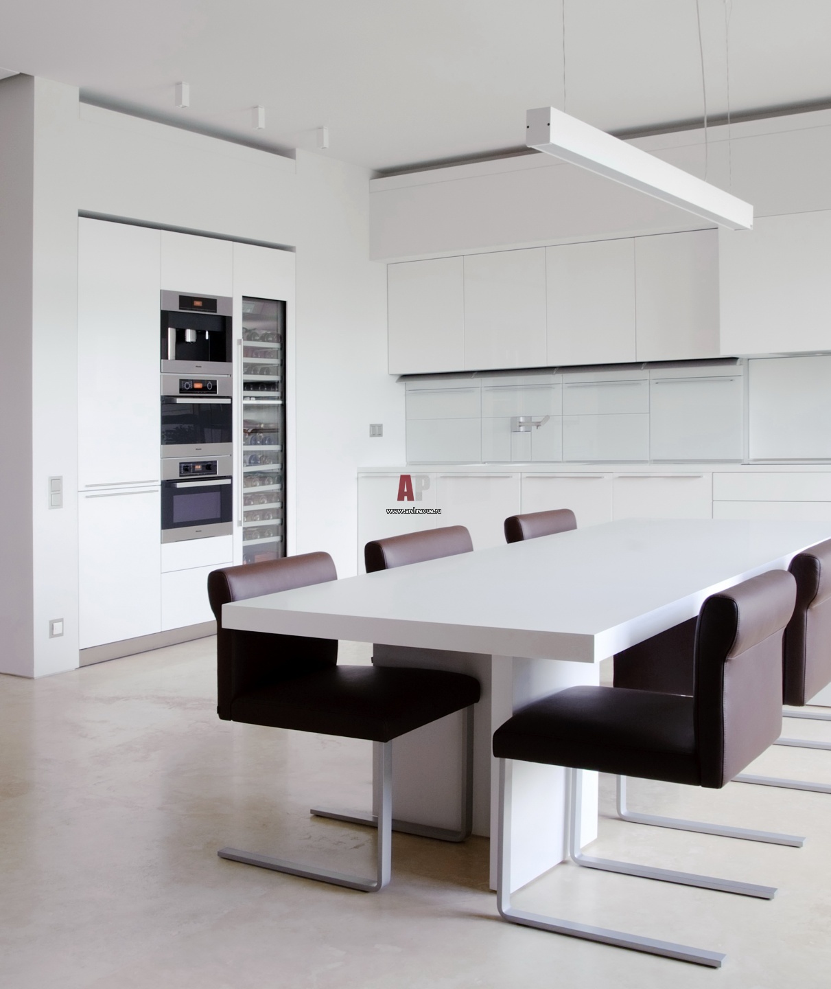 Минималистичный интерьер кухни выполнен в белом цвете. Кухня, Bulthaup. На полу – травертин.