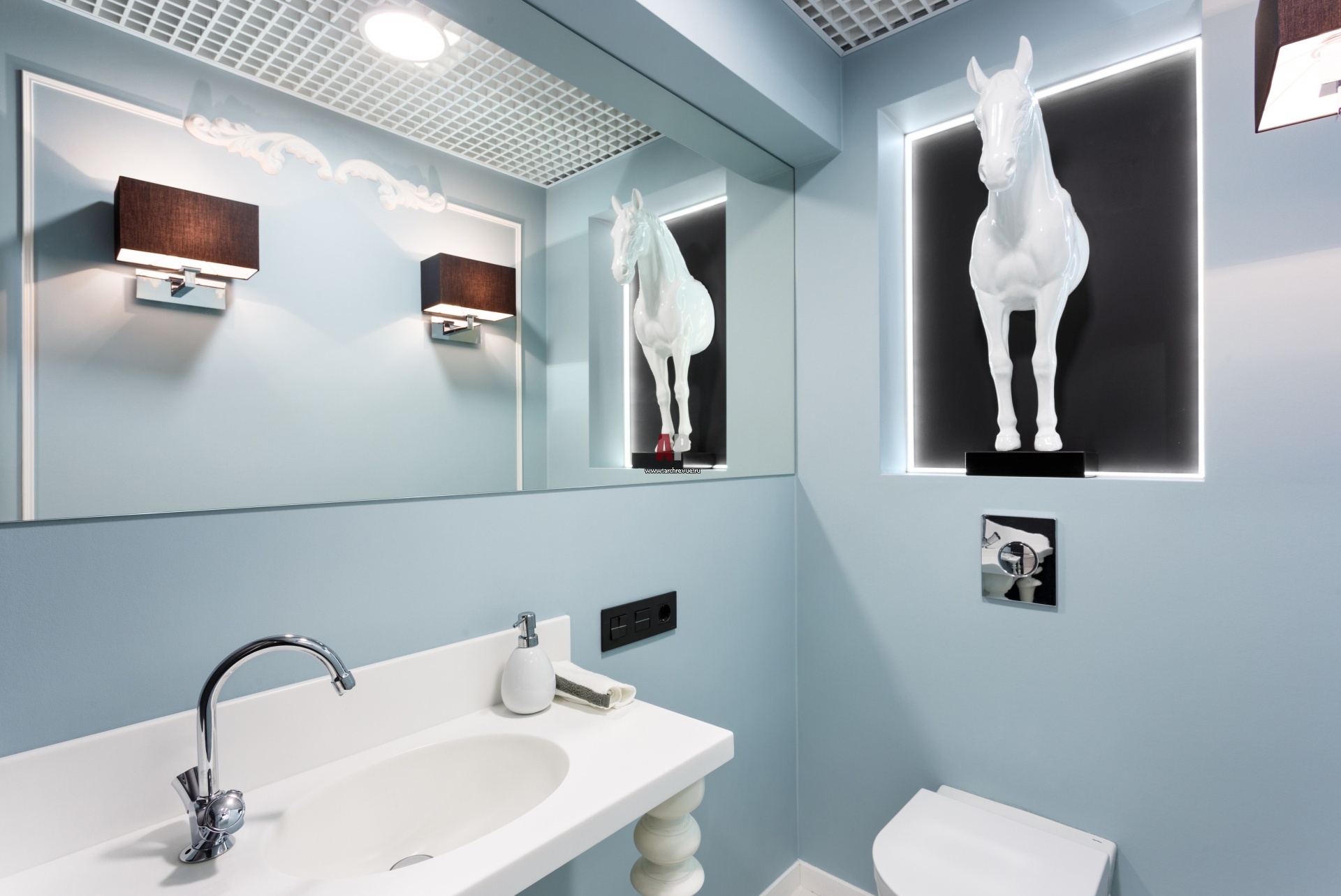 Центральный элемент небольшого санузла – ироничная фигура лошади, Kare Design. Она расположена в нише с подсветкой и отвлекает внимание от объема помещения. Стены выкрашены в серо-голубой цвет. Сантехника, Ideal Standard.