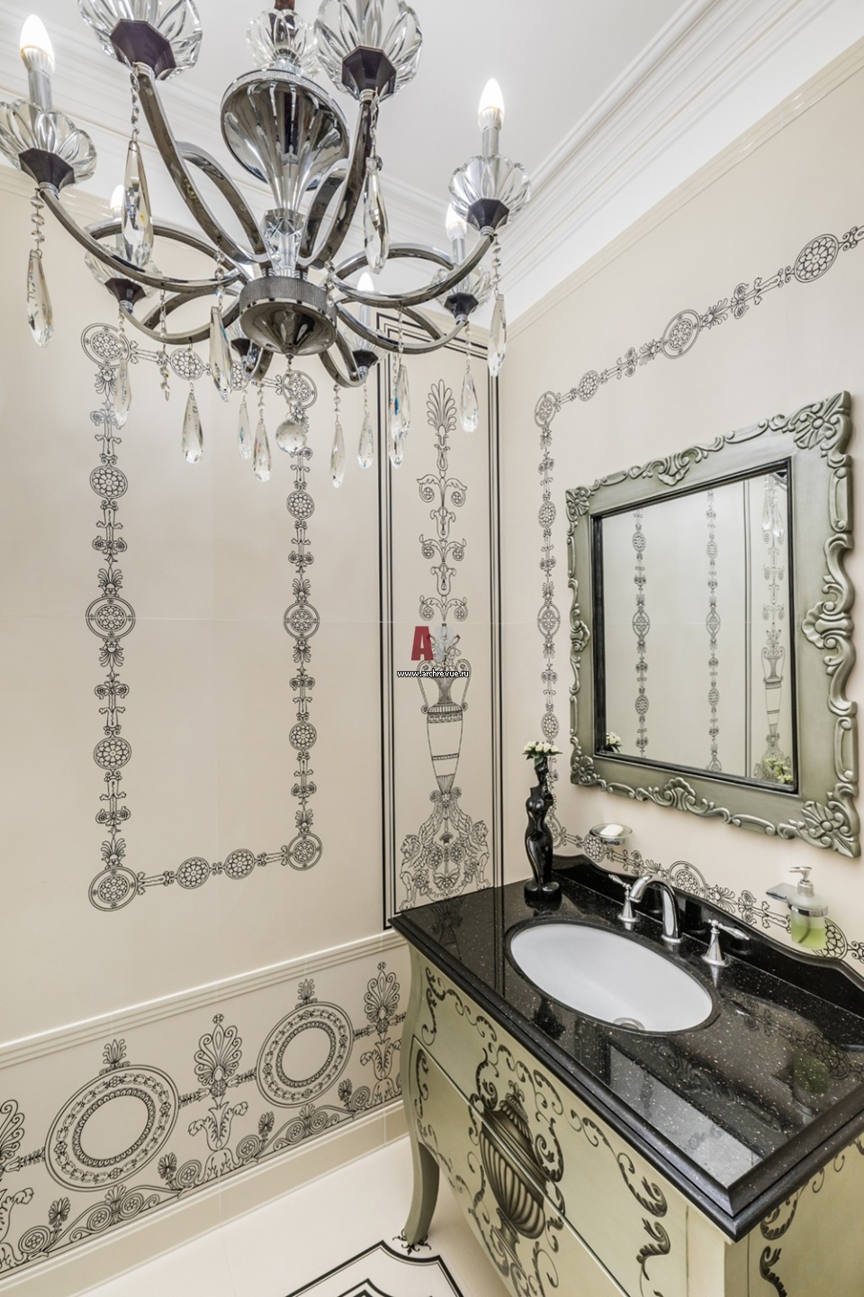 Один из санузлов оформлен в черно-белых тонах. На стенах – керамическая плитка с классическим орнаментом. Умывальник и люстра исполнены в черном цвете.