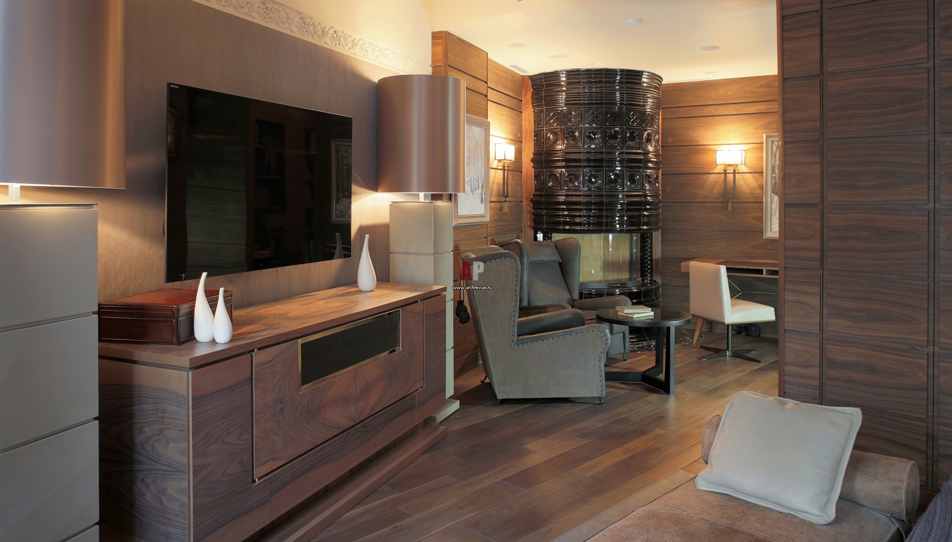 Приватная гостиная с кабинетом и камином в отделке панелями из массива ореха. Бра, Fine Art Lamps.