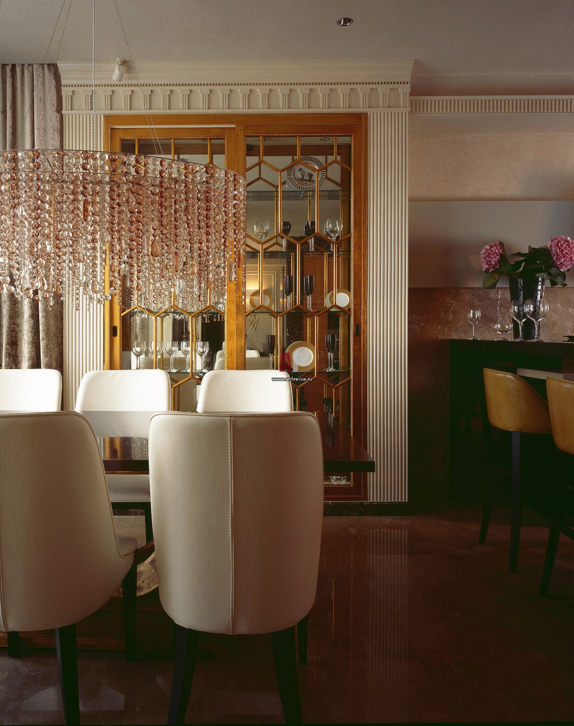 Встроенный в стену и обрамленный лепными карнизами золотой сервант выполнен по чертежам архитектора, образцом для него послужил английский антикварный буфет.