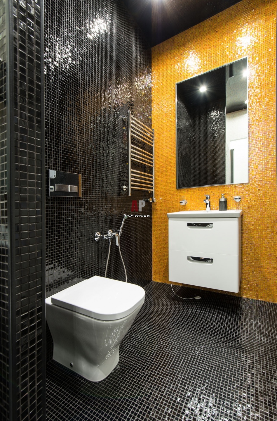 Интерьер гостевого санузла с черной мозаикой в мужской квартире. Стена за умывальником выделена мозаикой яркого мандаринового цвета.