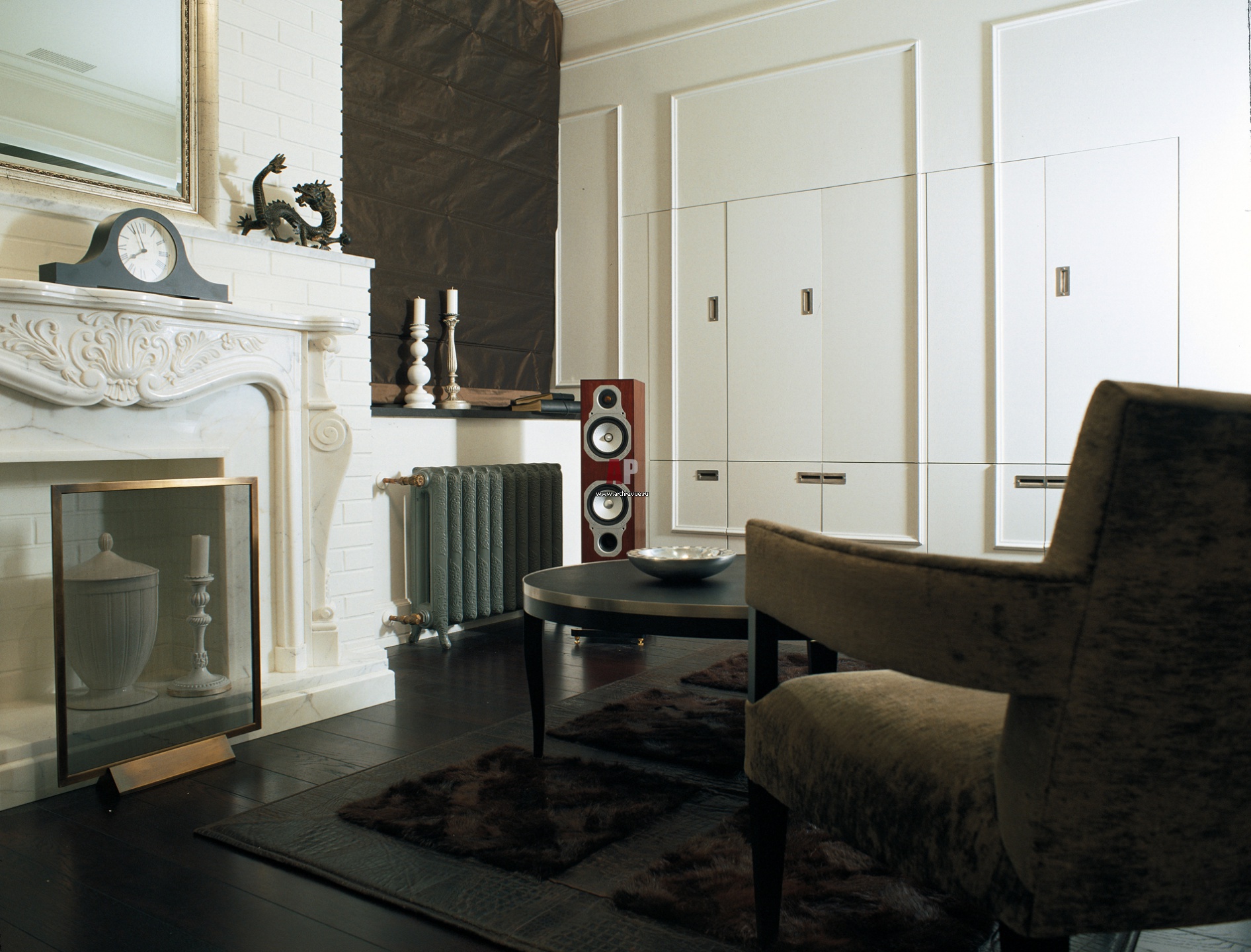 Зона камина в гостиной. Портал камина из резного мрамора выгодно контрастирует с кирпичной кладкой стен. За створками белого шкафа находится плазма и видеооборудование домашнего кинотеатра.
