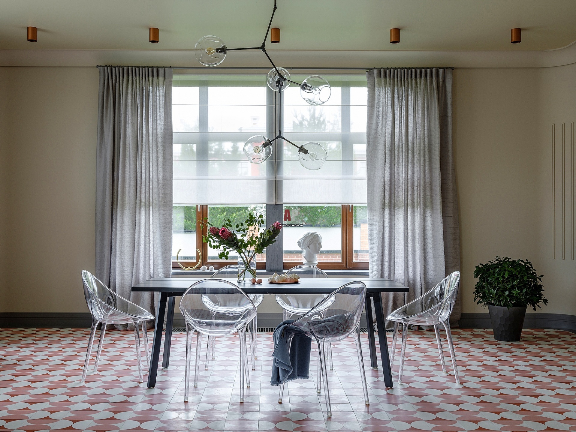 Интерьер загородного дома для большой семьи. Столовая выполнена в современном стиле. На полу – плитка Bisazza (по дизайну Индии Мадави) с коралловым рисунком. Стулья из прозрачного пластика, Kartell.