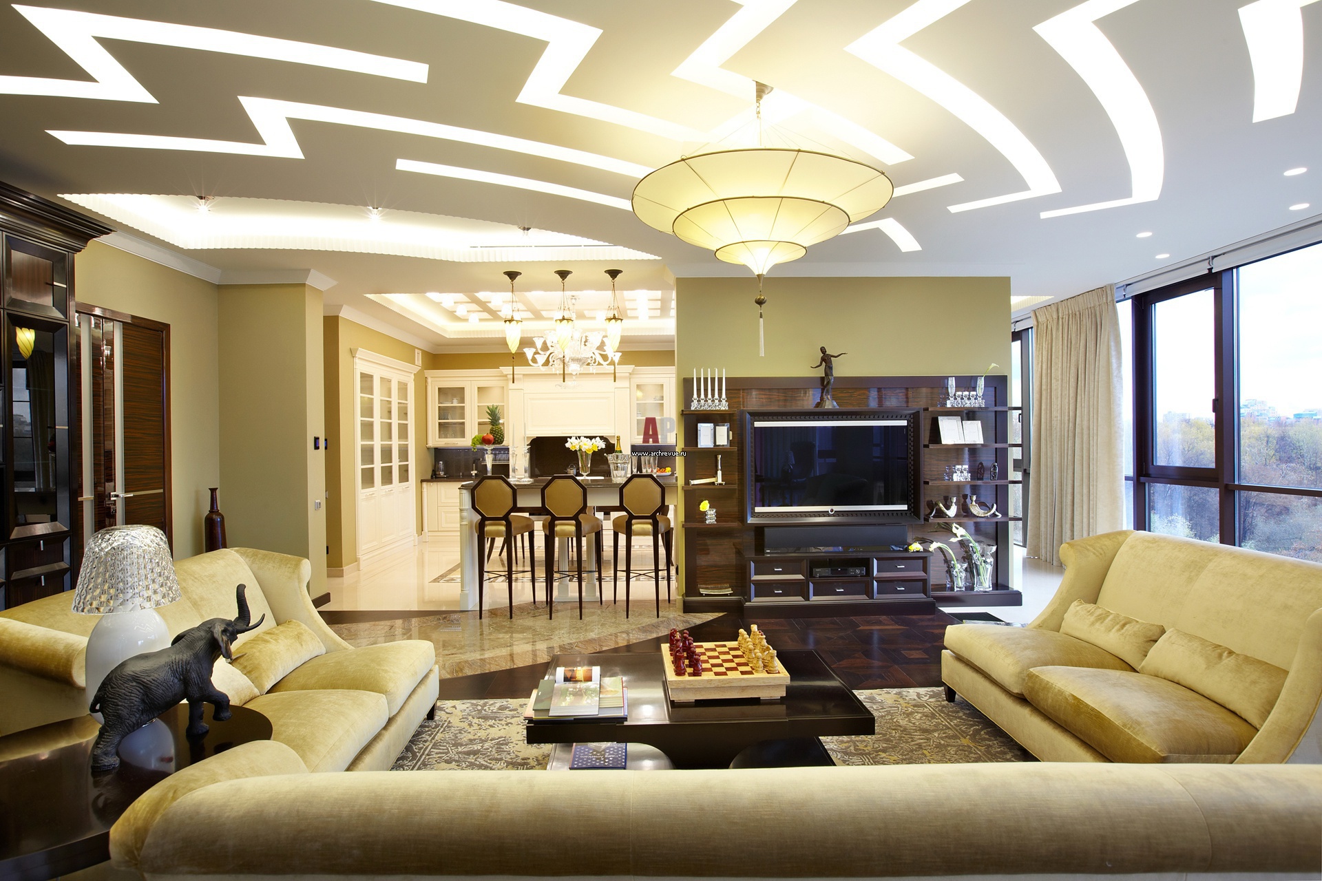 Интерьер общей зоны квартиры в стиле ар-деко. Двухуровневый потолок гостиной выглядит как лабиринт: поверхность разрезана зигзагообразными и прямоугольными линиями, которые расходятся радиусом. Внутри прорезей – встроенные светильники.
