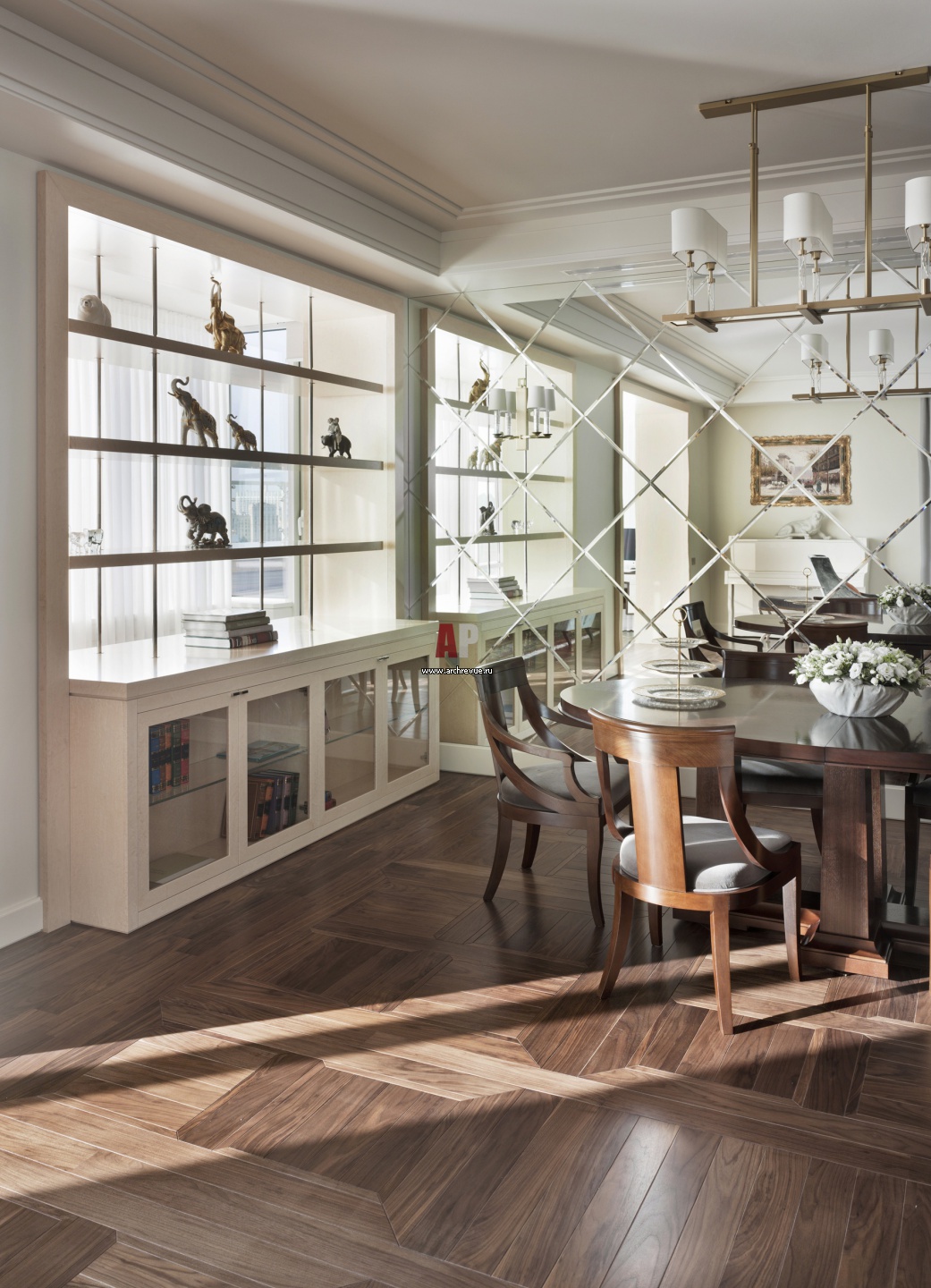 Парадная столовая решена как продолжение гостиной. Ее выделяет зеркальная стена и шкаф-перегородка.