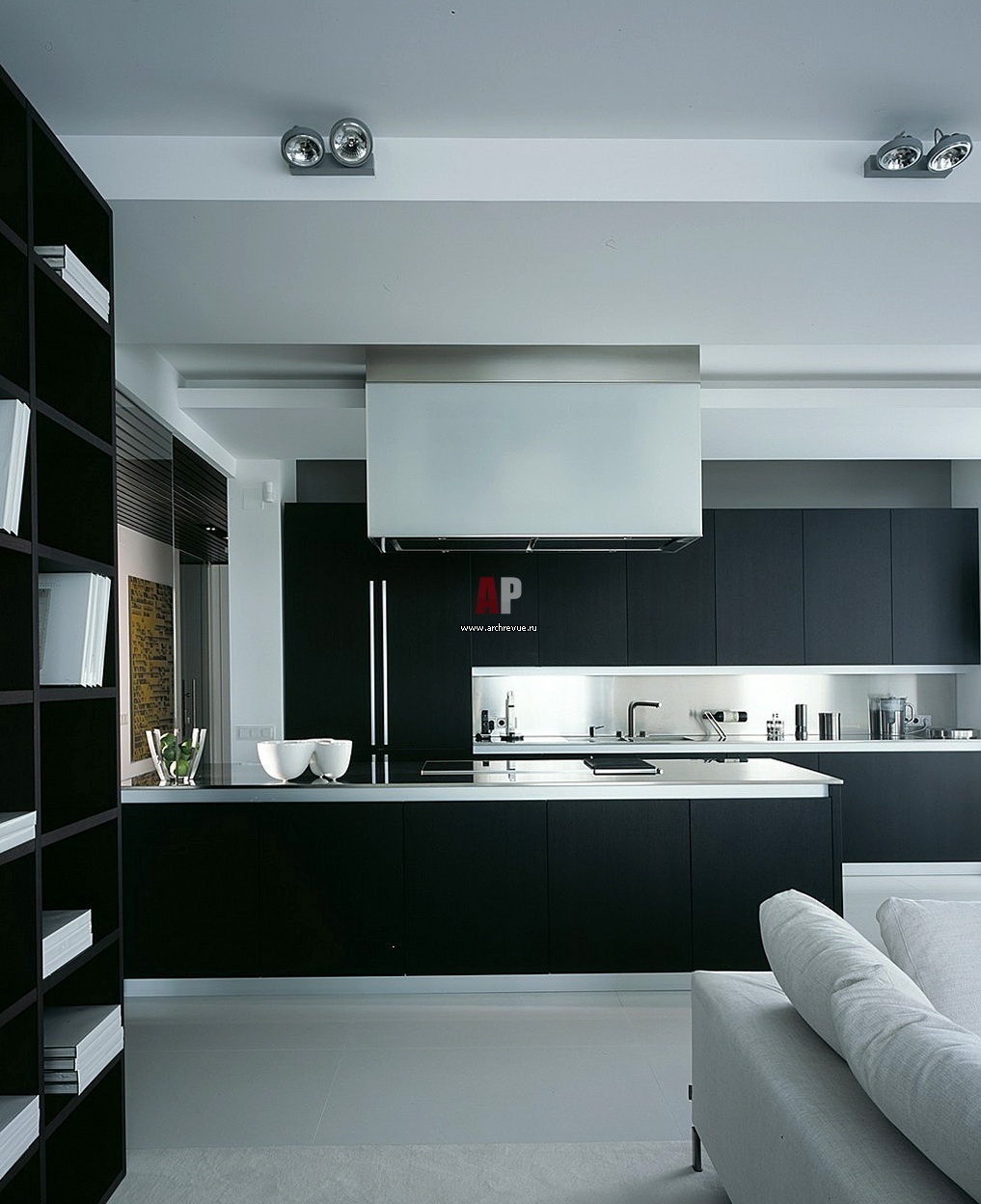 Кухня включена в общую гостевую зону. Фасады кухонного гарнитура решены в темном дереве, на полу – белый камень. Вытяжка обыграна как архитектурный объем.